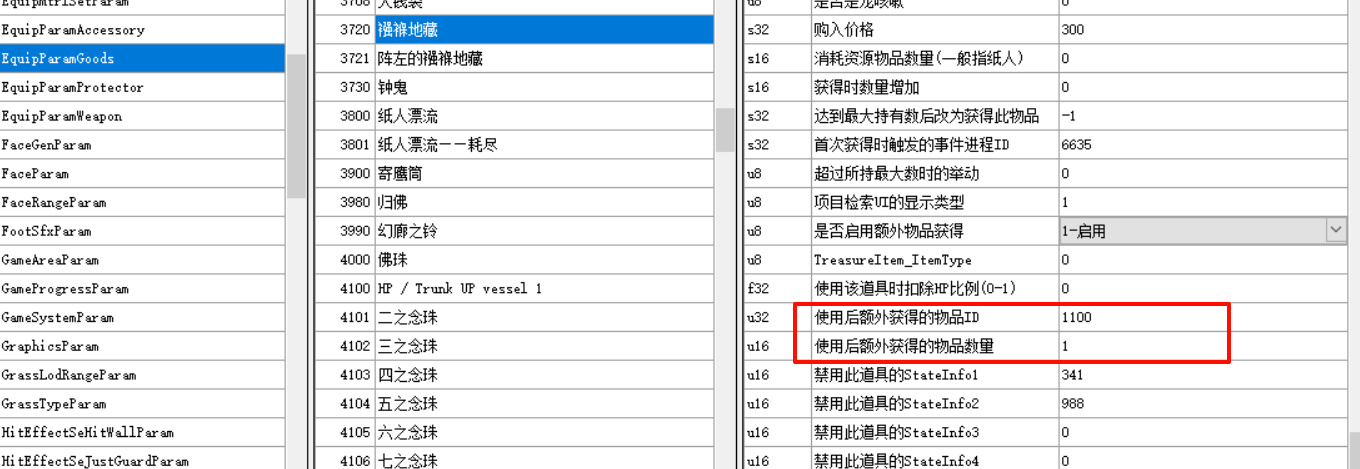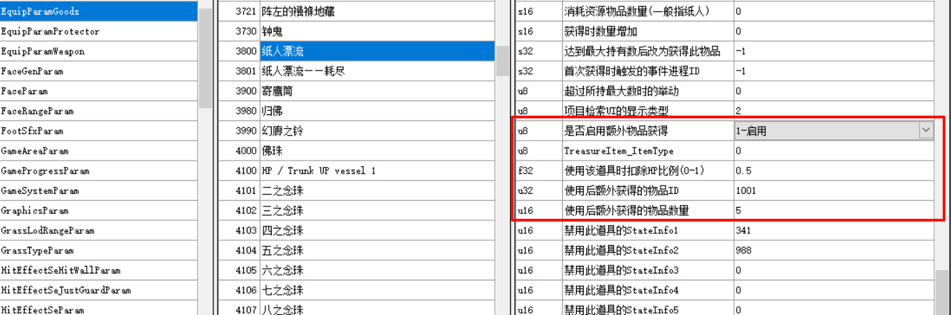 比如,襁褓地藏使用后获得物品id1100[复生]*1,纸人漂流使用后获得物品id1001[红色纸人]*5,以此实现物品联动使用。