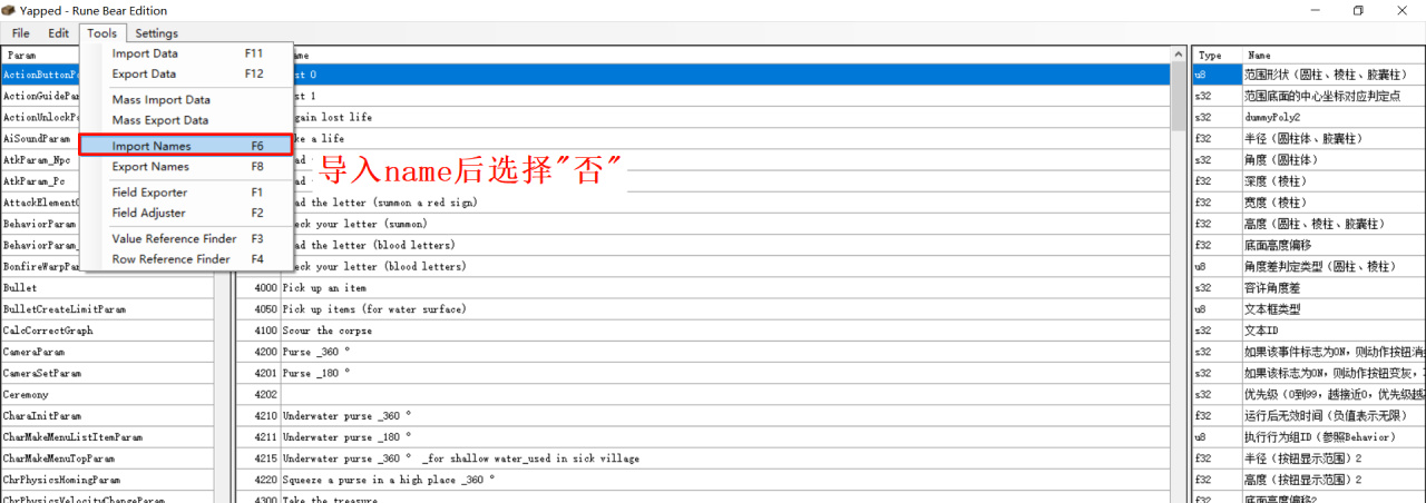 Yapped按下F6即可导入Names,导入时选“否”;文件夹内有一个后缀Original的原版参数文件备份。