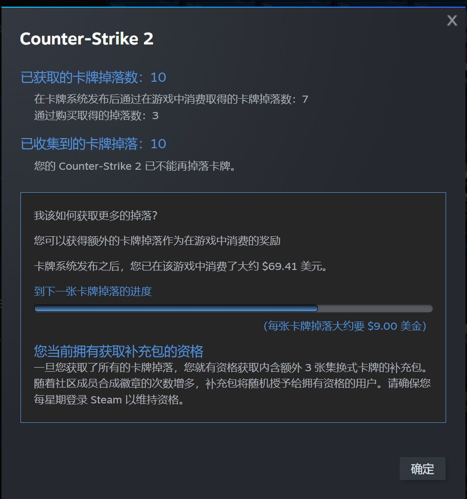 补充包的获取资格:拥有这款游戏且可掉落卡牌已经获取完,具体到一个游戏也可在徽章页面查看是否有资格。