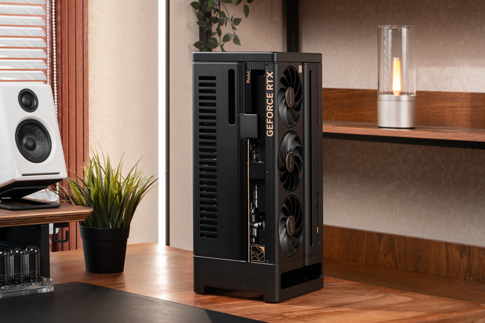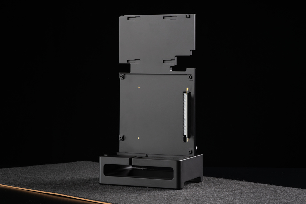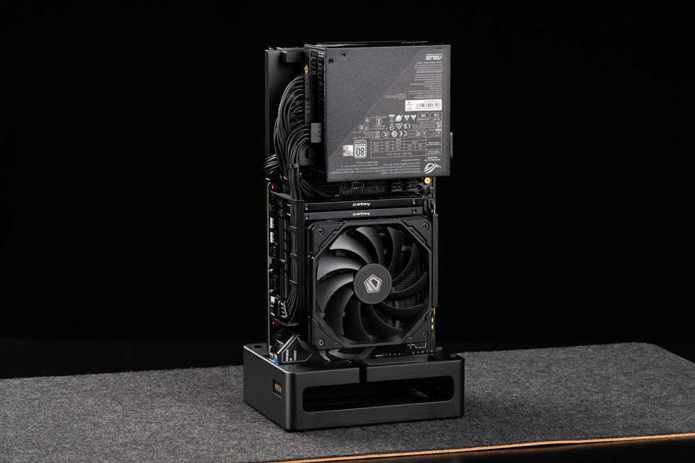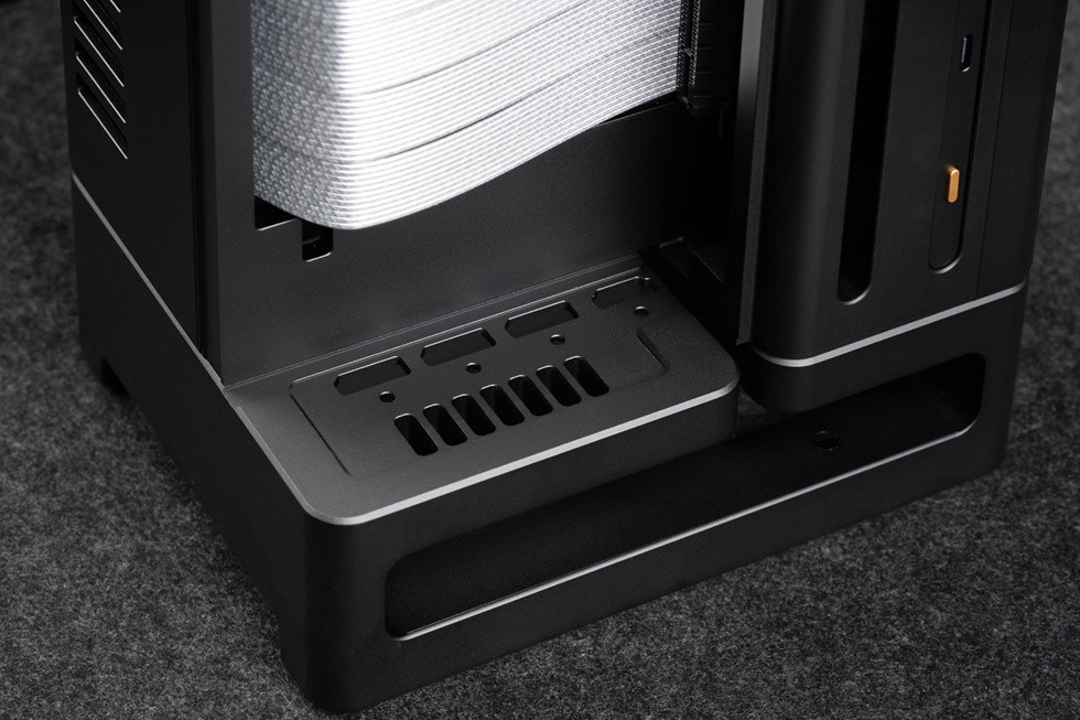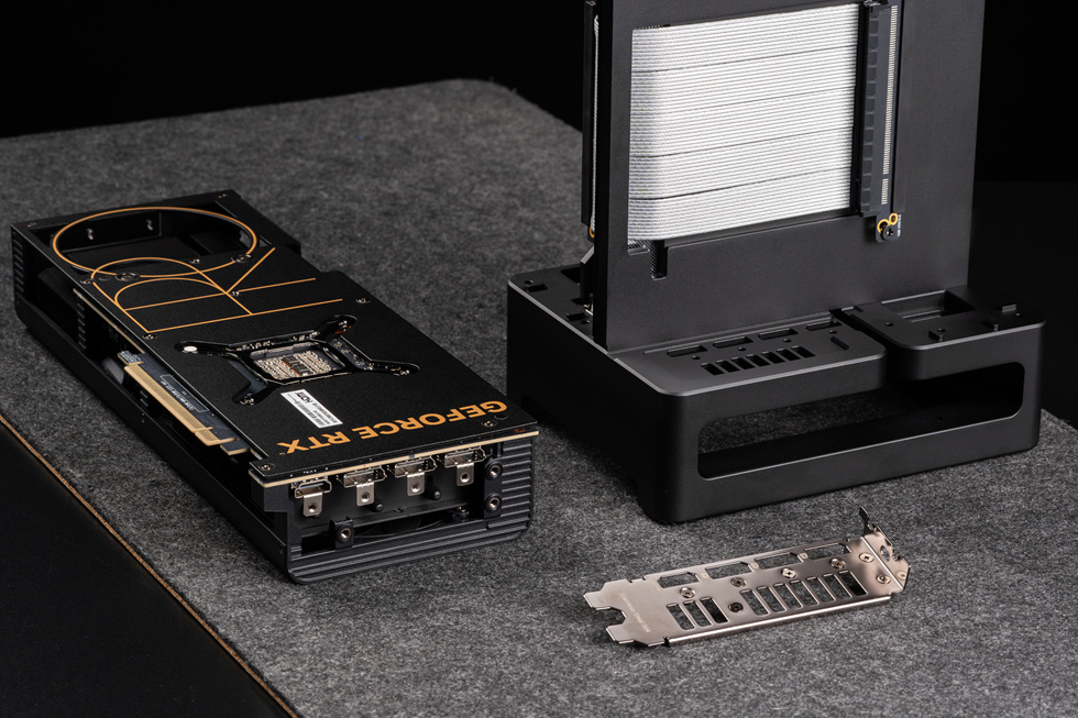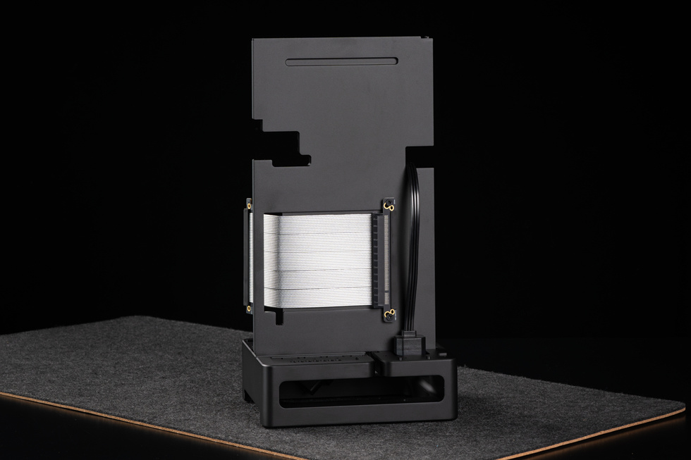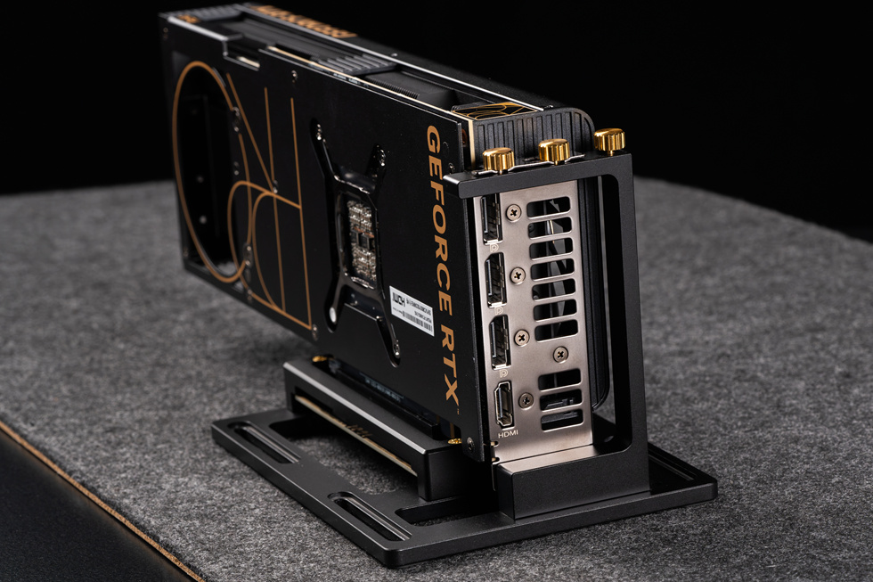 顯卡採用豎插IO朝下的方式設計,在底座上進行了顯卡銑槽,直接將顯卡IO擋板拆下,固定在機箱上面,融爲一體。