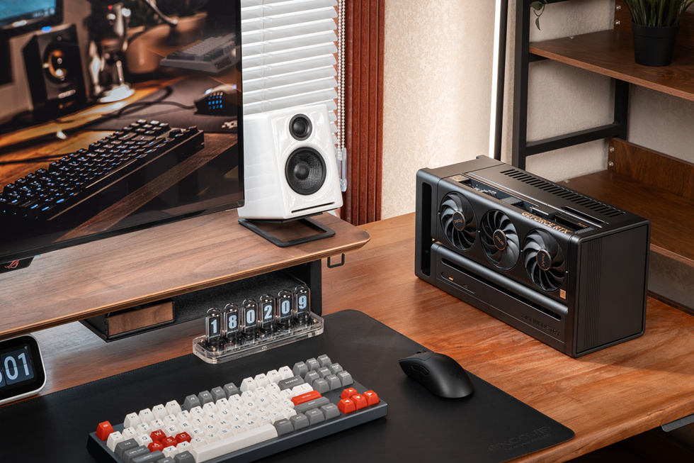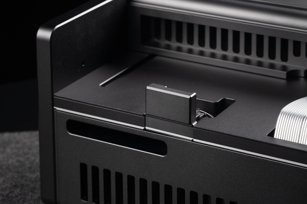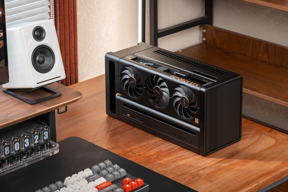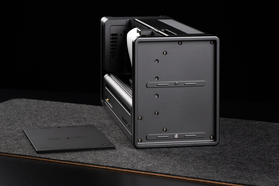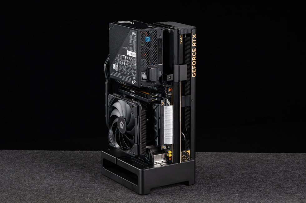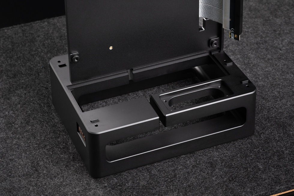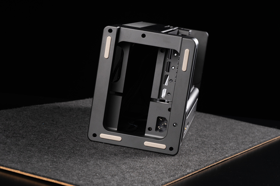 顯卡採用豎插IO朝下的方式設計,在底座上進行了顯卡銑槽,直接將顯卡IO擋板拆下,固定在機箱上面,融爲一體。