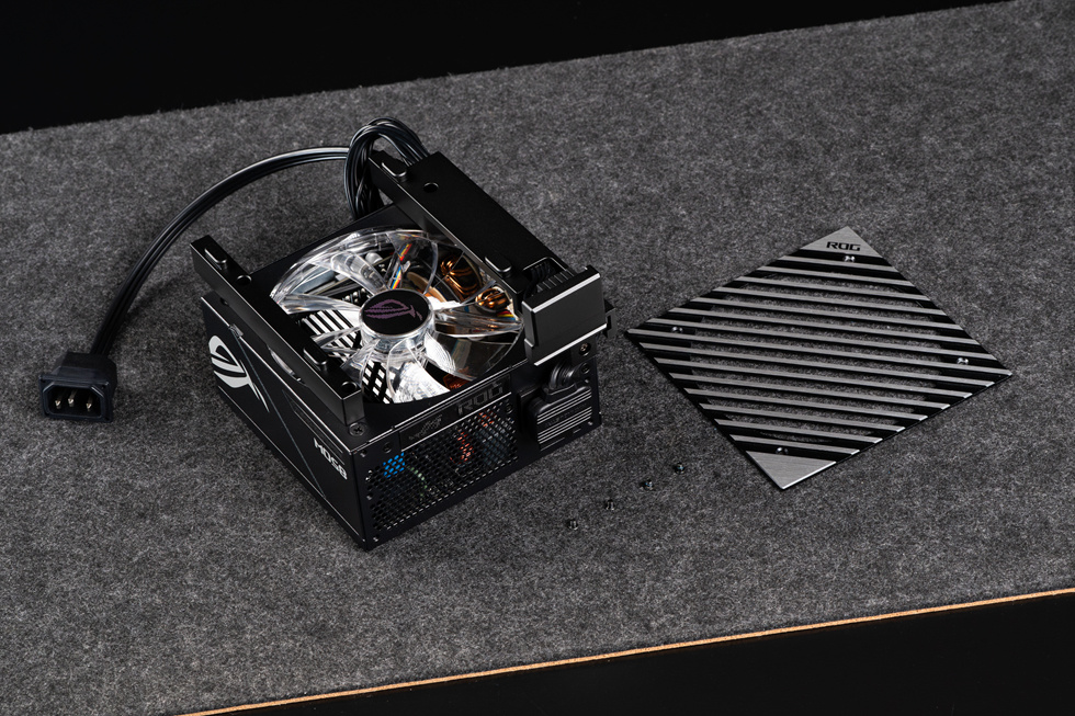鋁製的風扇格柵顯得高檔醒目,下方安裝的則是12015規格的軸流式風扇,扇葉末端帶有風扇環,據稱有提升風速和風壓的作用,以達到強化散熱的效果。此外風扇採用的是透明框架與透明扇葉設計,支持AURA SYNC燈效同步,這也是目前ROG旗下唯一在風扇上提供ARGB燈效的電源產品。