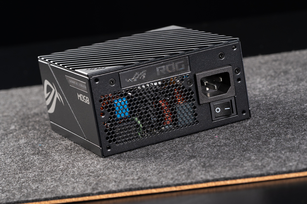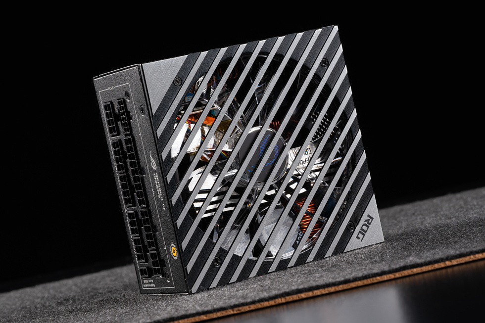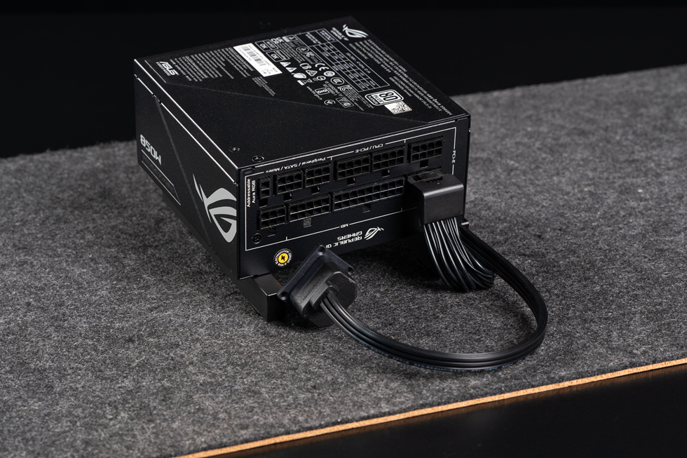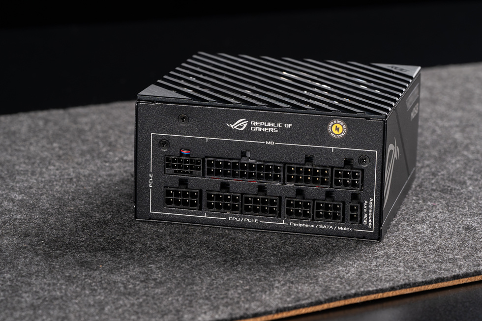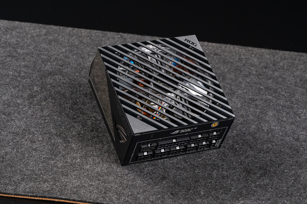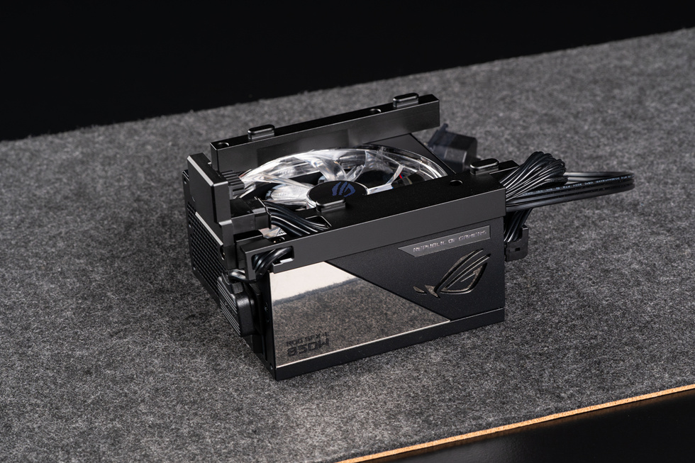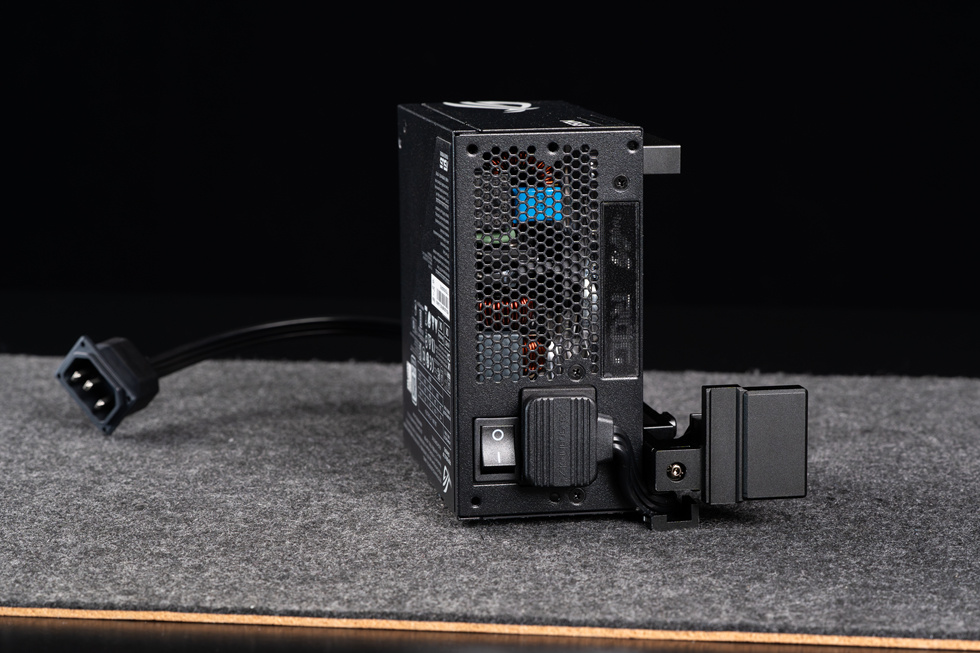 電源的側面也基本沿用了ROG THOR系列的設計,但沒有用上ROG THOR系列的功率計,因此銀色的部分就是一塊單純的鏡面,配合黑色的區域形成一個銀黑撞色設計。