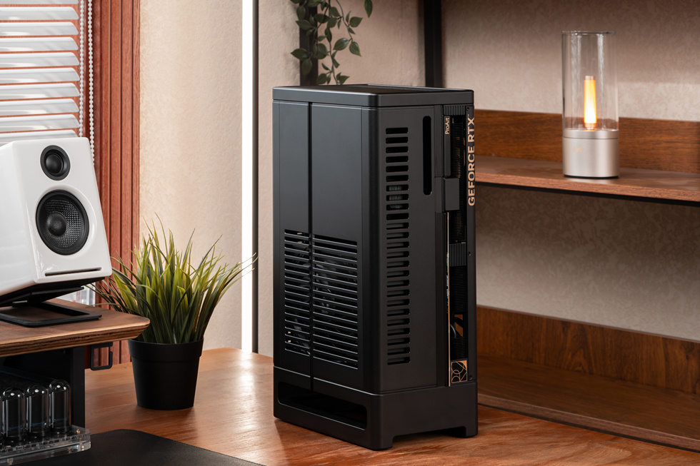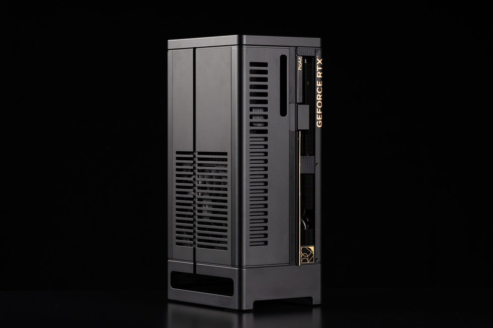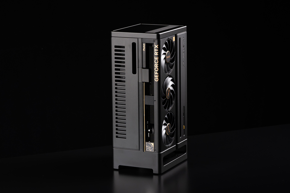 機箱左側位置爲顯卡安裝區域以及機箱開機按鍵和IO區域,IO立柱有一條顯卡散熱出風風道設計,設計十分巧妙,顯卡底部熱氣從此排出。綁定華碩ProArt 4070ti及以上型號顯卡,作爲機箱的一部分,可以完美融入箱體。