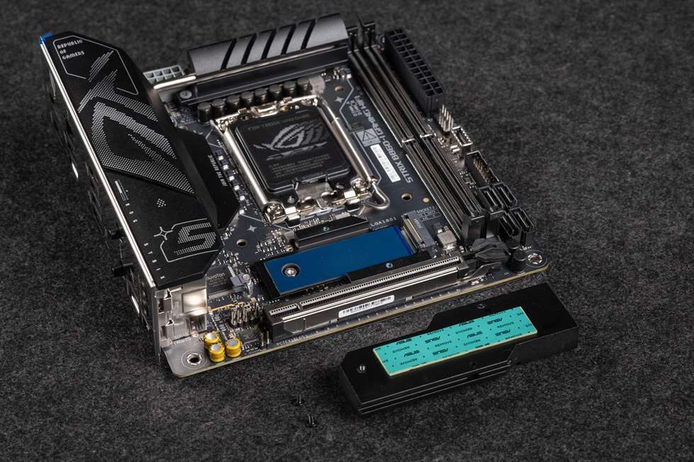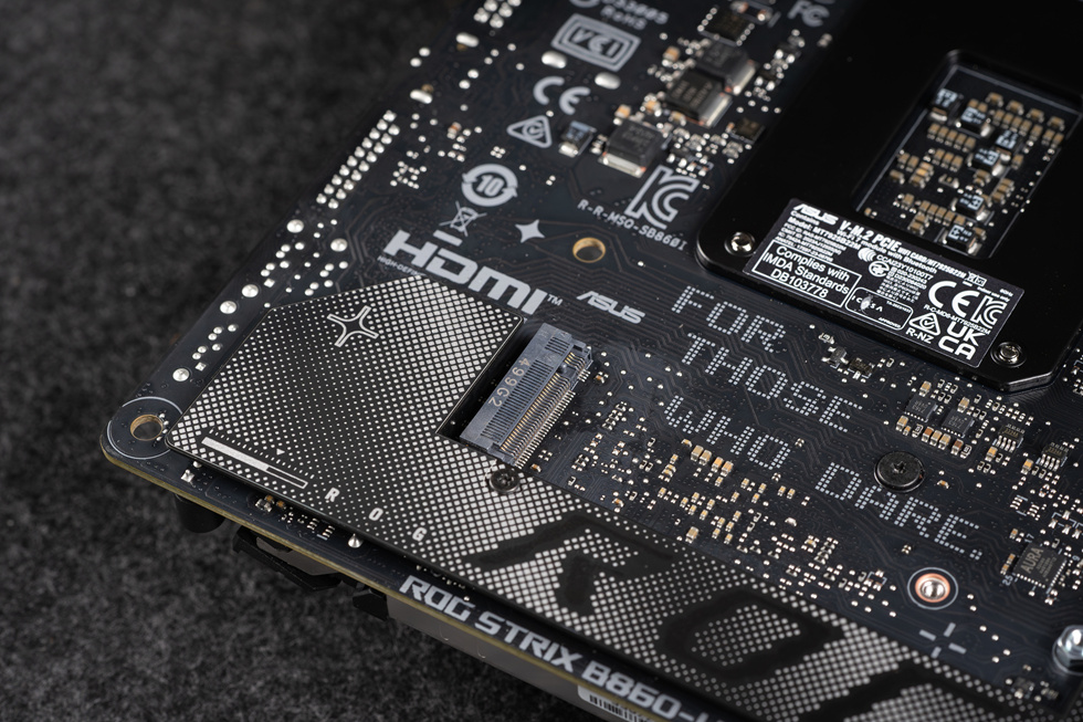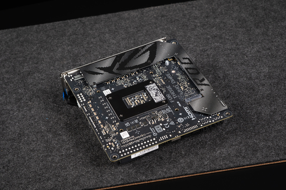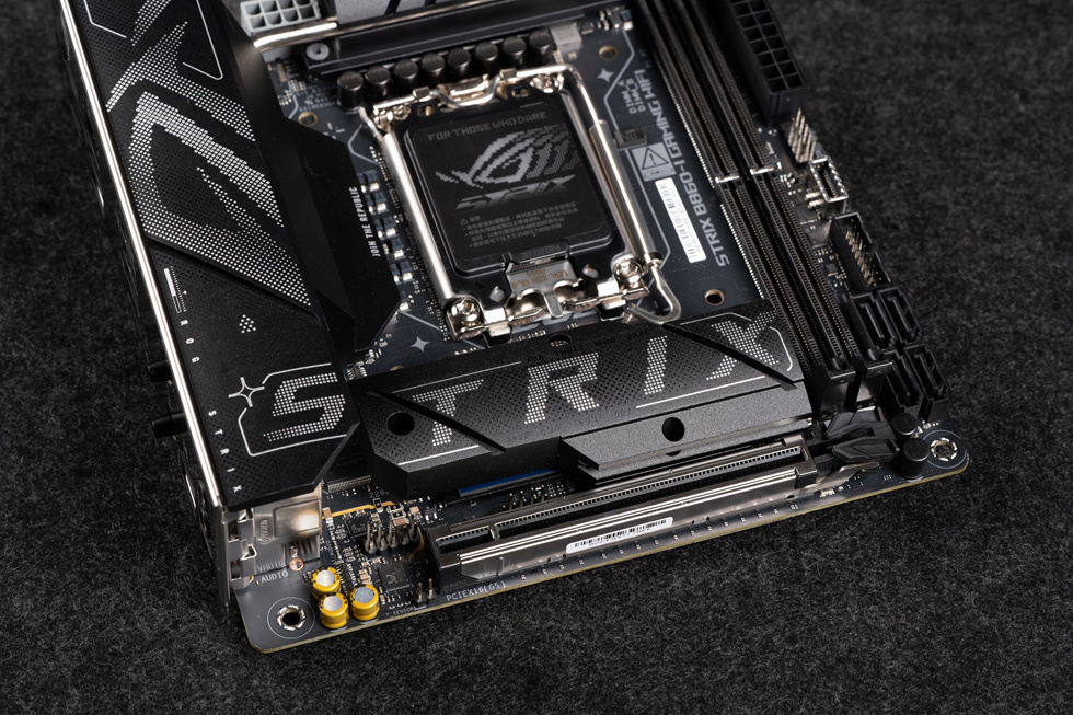 整體設計非常協調,主板下方M.2散熱裝甲,弧形造型設計,一改以往傳統設計,IO裝甲上面的“S”與M.2散熱片形成連接,組成“STRIX”設計。