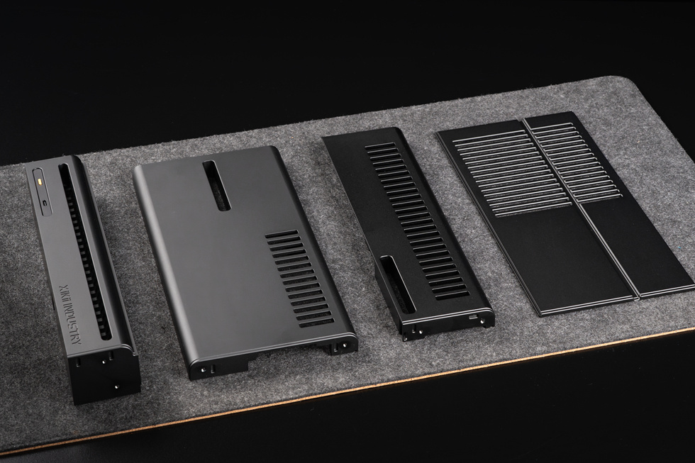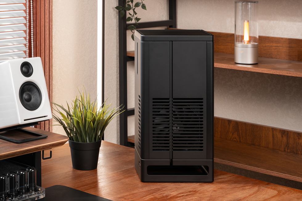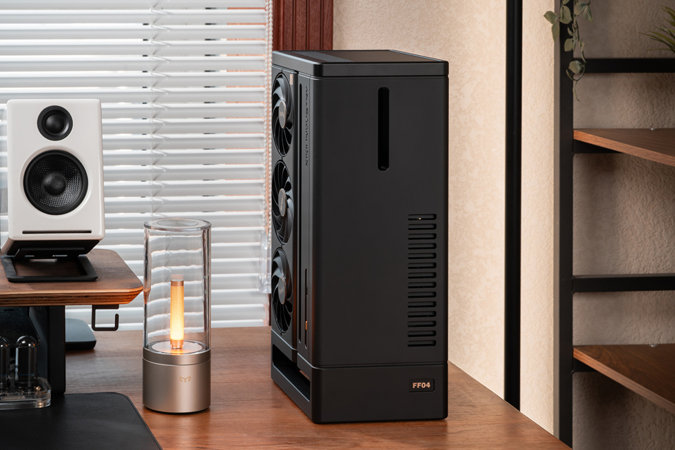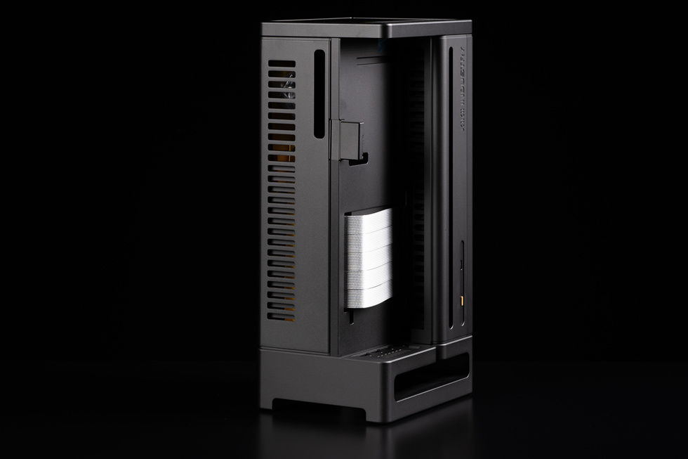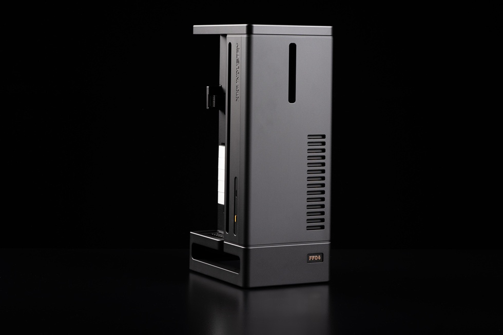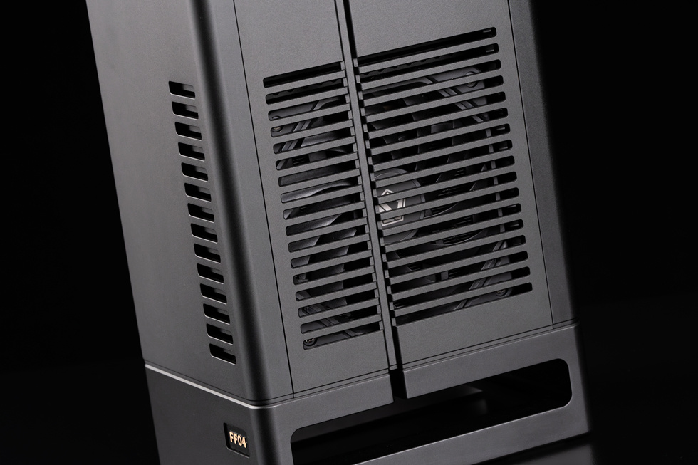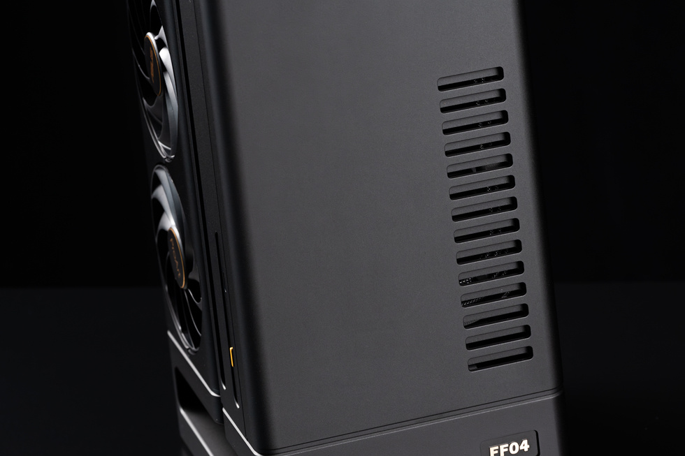FF04機箱整體採用立式設計,主板面有格柵開孔,用於散熱進氣,右側貫穿整個機箱格柵孔,包含CPU主板以及電源散熱孔。