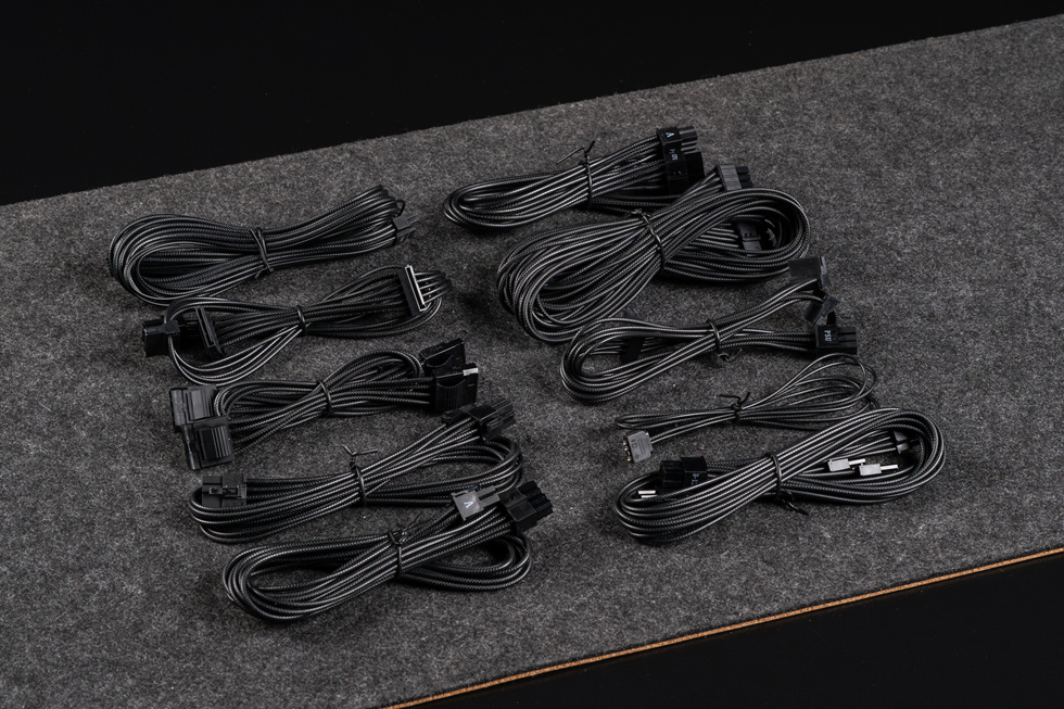 電源採用全模組接口設計,提供了3個8pin接口用於擴展CPU 4+4pin與PCI-E 6+2pin供電,有3個6pin則用於擴展SATA供電以及D型4pin供電,同時提供有1個12+4pin的原生12VHPWR線材接口,可用於擴展600W功率的12VHPWR供電接口,也可以通過標配的轉接線擴展爲兩個PCI-E 6+2pin供電接口。