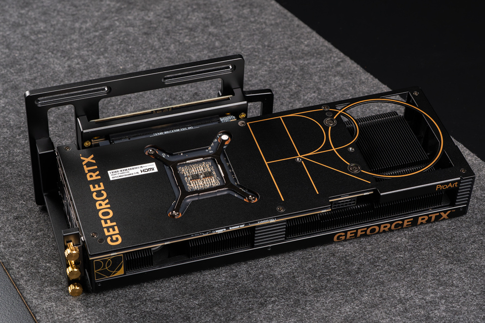 整體採用金屬打造,採用黑色磨砂面,較大的圓弧邊緣,讓整塊顯卡看起來相當有質感,整流罩上的“GEFORCE RTX”和ProArt的Logo都是金色,黑色與金色的組合形成經典的黑金配色,非常搭配。