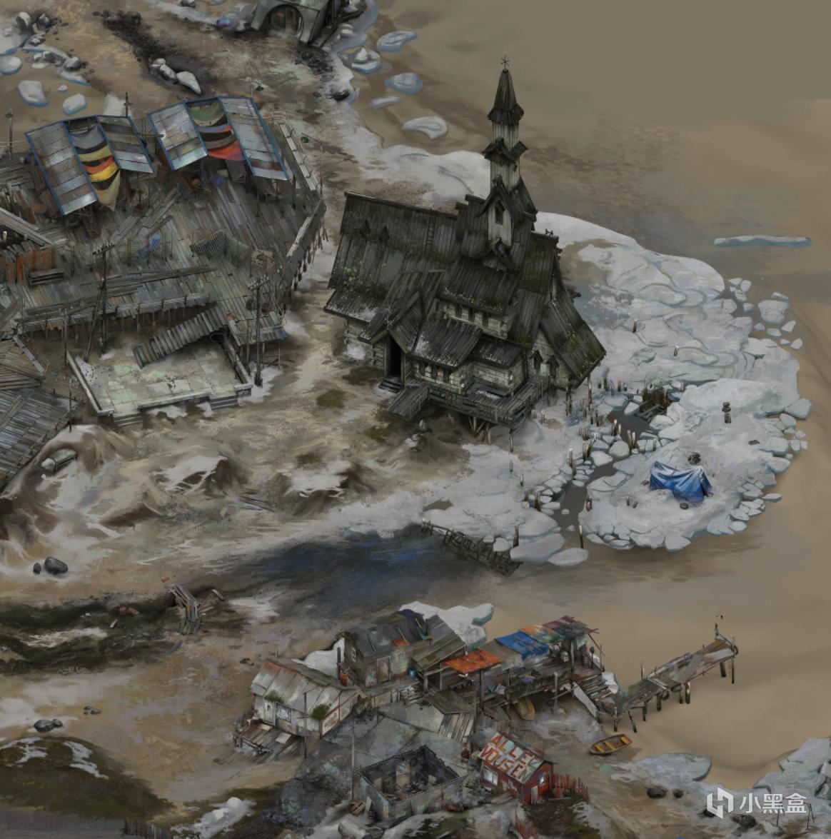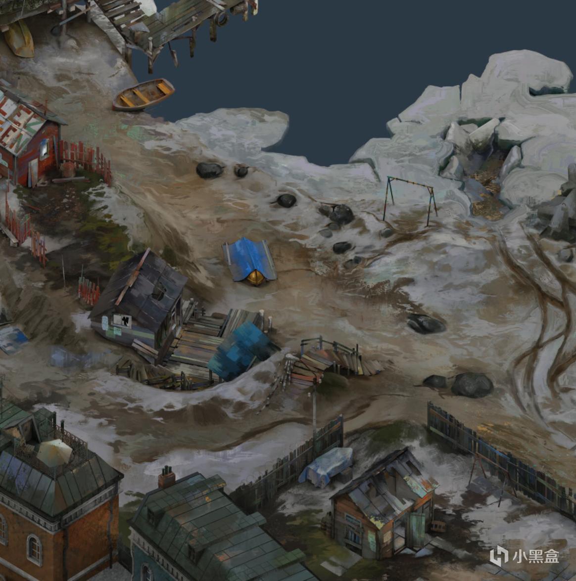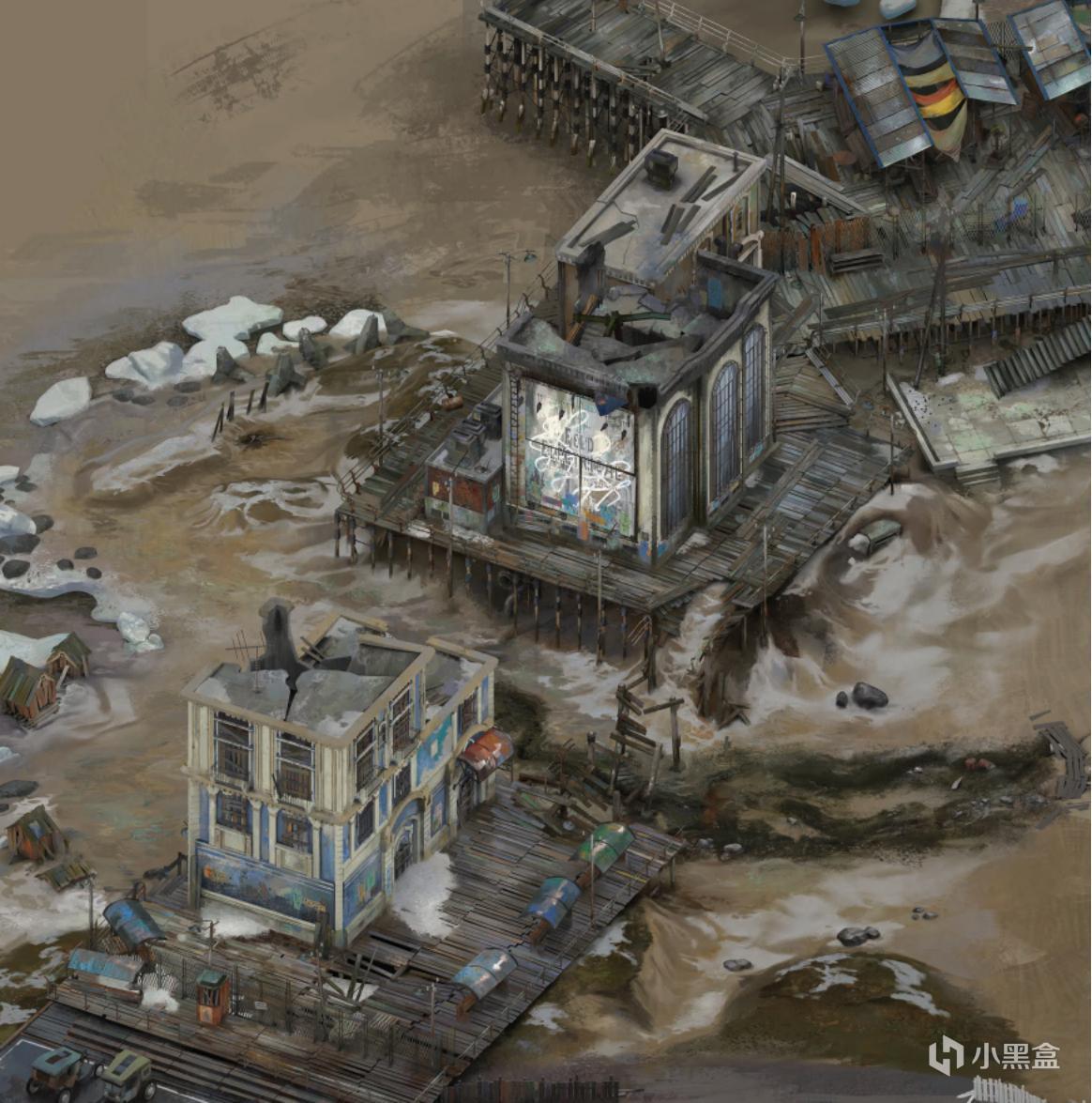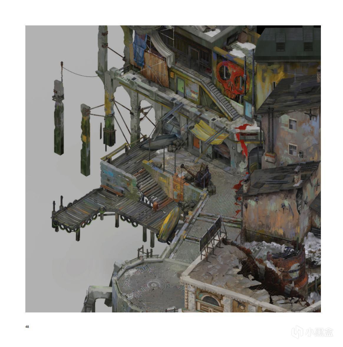 例如,讓我們看看水閘和交通堵塞之間的區域。如果你仔細觀察商販西倫東側廢墟建築內的黑暗,你會發現只有零星可辨的邊緣,幾乎所有事物都是一種顏色與另一種顏色微妙過渡的漸變。在當鋪的基座附近,牆壁與地面之間的邊緣非常柔和。如果你仔細觀察停在西倫周圍的卡車的前輪,或者阻擋玩家進入工業風格庭院的明亮紅色Delta物流公司車輛, 你會發現地面與車輛之間的塗裝邊緣常常消失。在更自然的區域,如漁村附近的沙丘或教堂附近隨意堆積的冰塊,這種現象則不那麼明顯。以這種方式繪製背景,能使整體更加統一。這種例子在遊戲中隨處可見