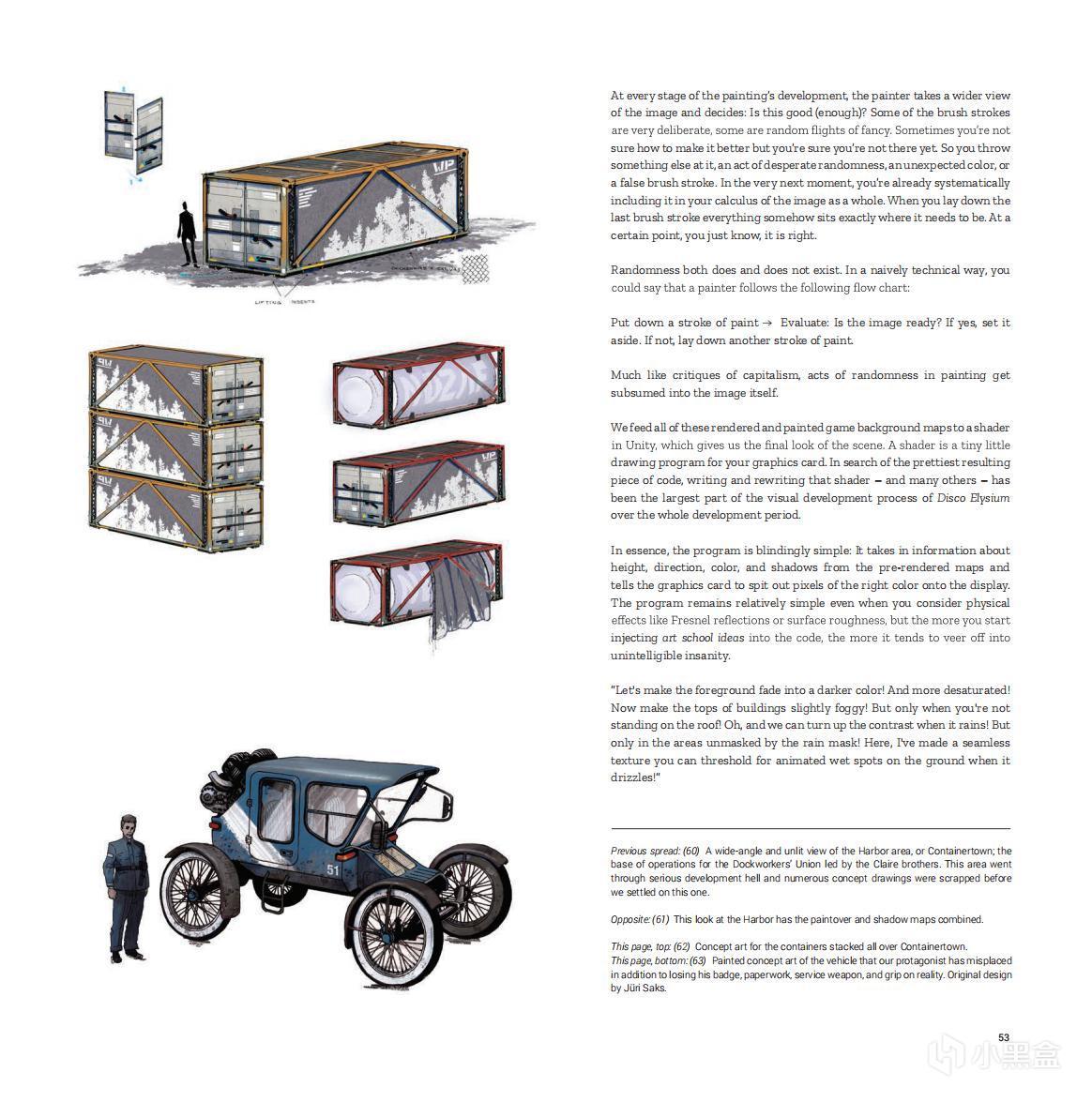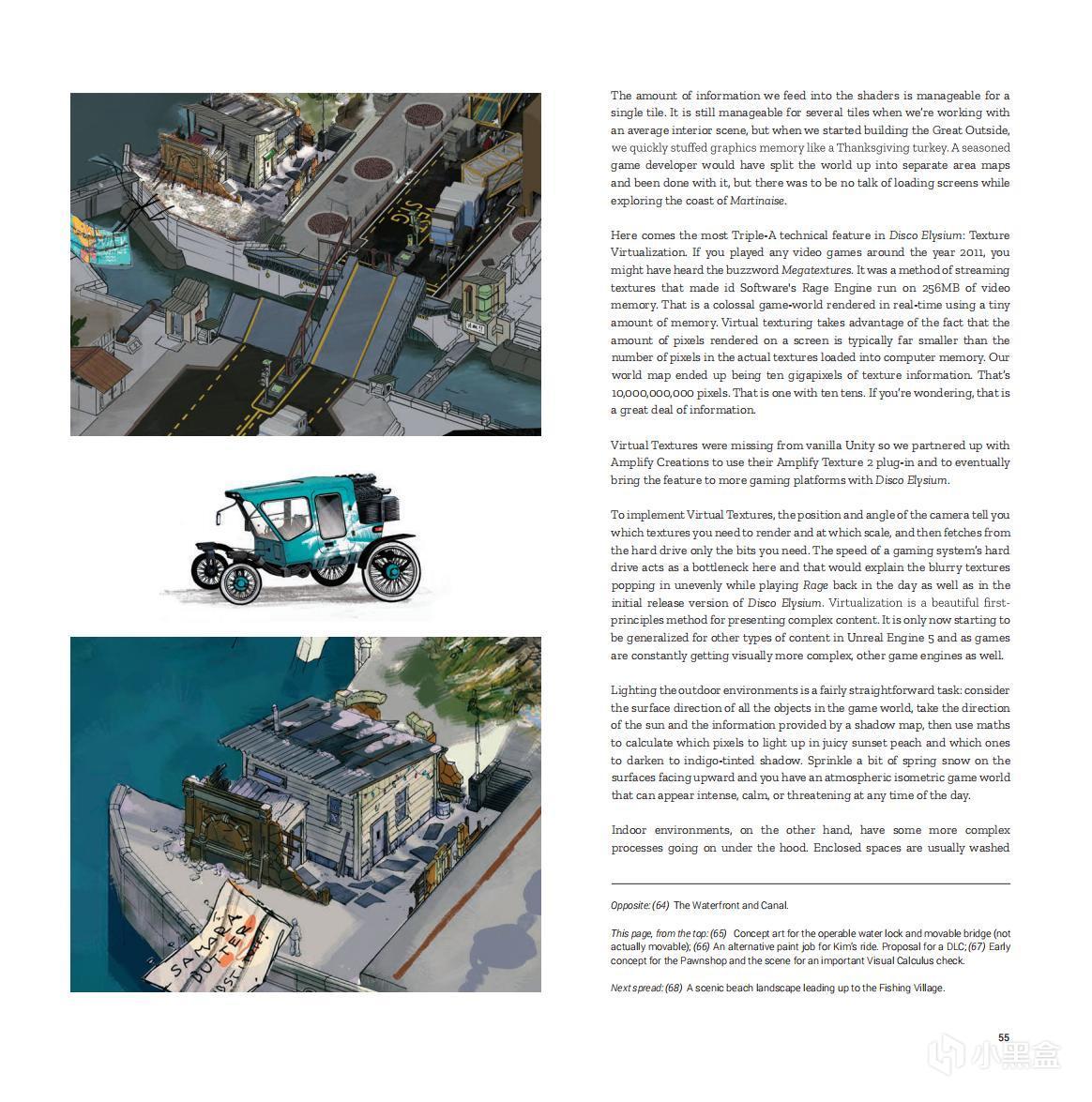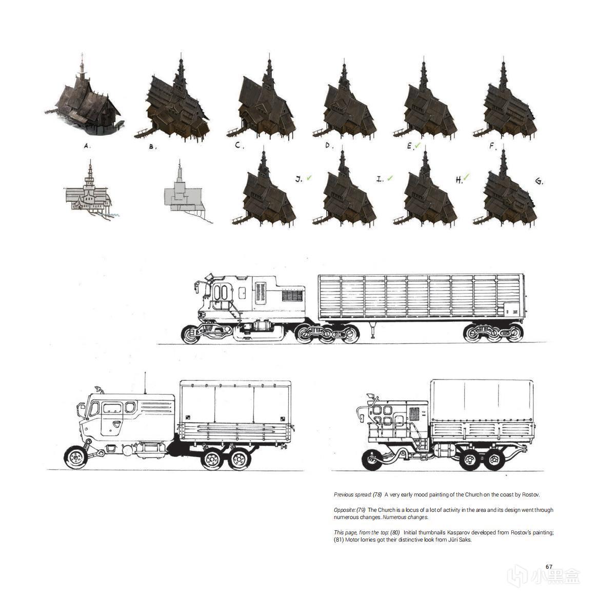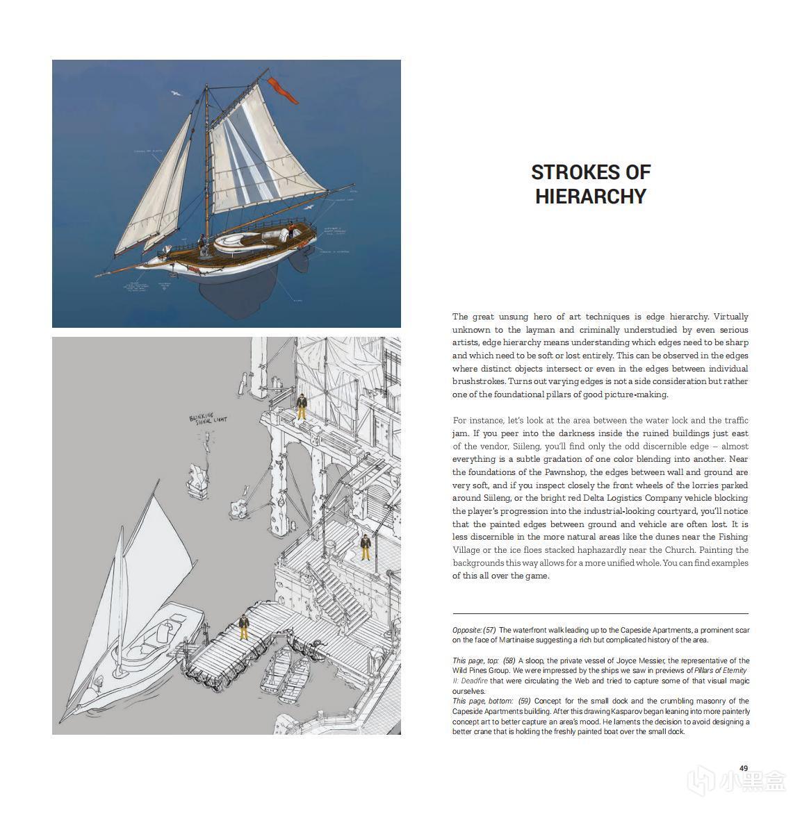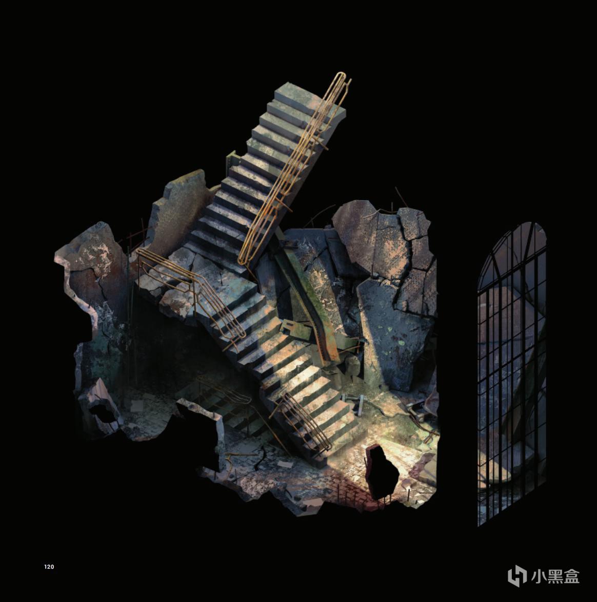 例如,讓我們看看水閘和交通堵塞之間的區域。如果你仔細觀察商販西倫東側廢墟建築內的黑暗,你會發現只有零星可辨的邊緣,幾乎所有事物都是一種顏色與另一種顏色微妙過渡的漸變。在當鋪的基座附近,牆壁與地面之間的邊緣非常柔和。如果你仔細觀察停在西倫周圍的卡車的前輪,或者阻擋玩家進入工業風格庭院的明亮紅色Delta物流公司車輛, 你會發現地面與車輛之間的塗裝邊緣常常消失。在更自然的區域,如漁村附近的沙丘或教堂附近隨意堆積的冰塊,這種現象則不那麼明顯。以這種方式繪製背景,能使整體更加統一。這種例子在遊戲中隨處可見