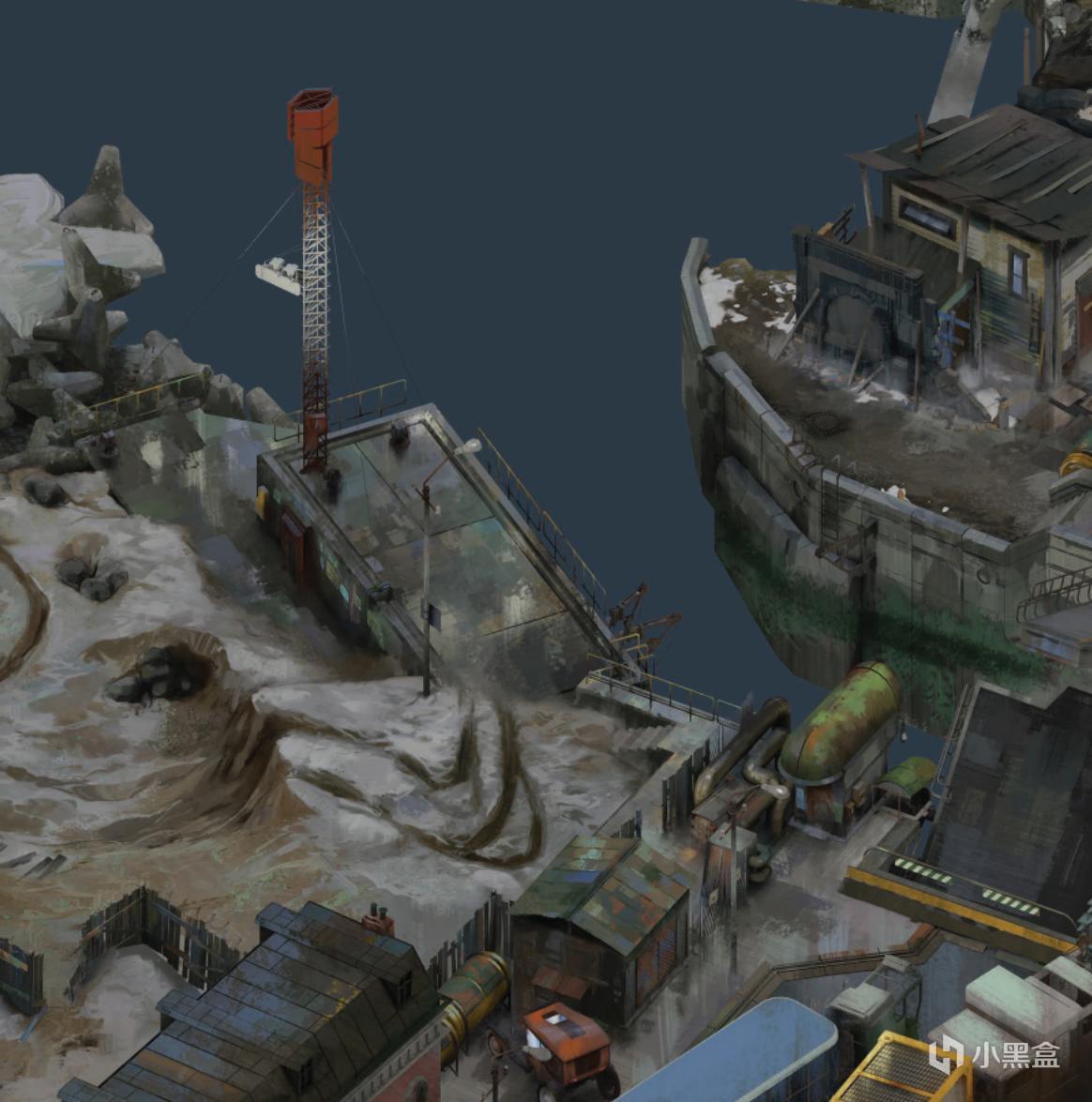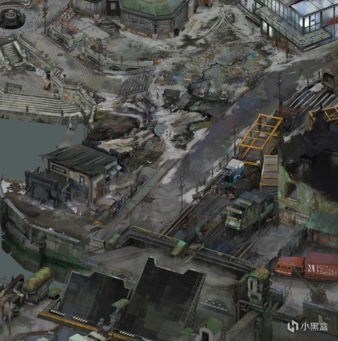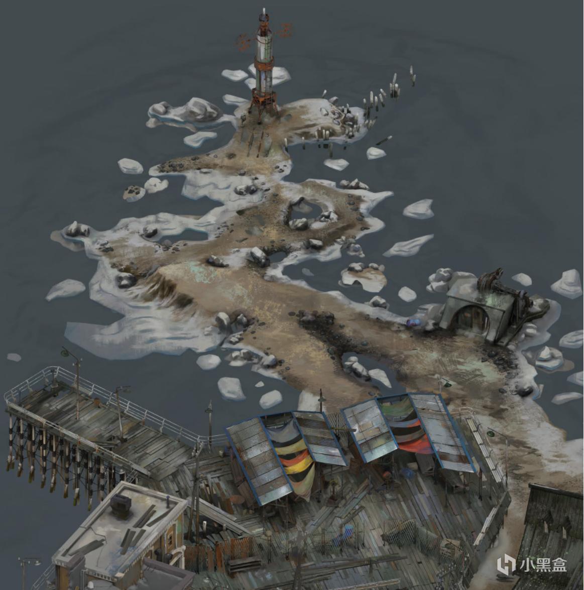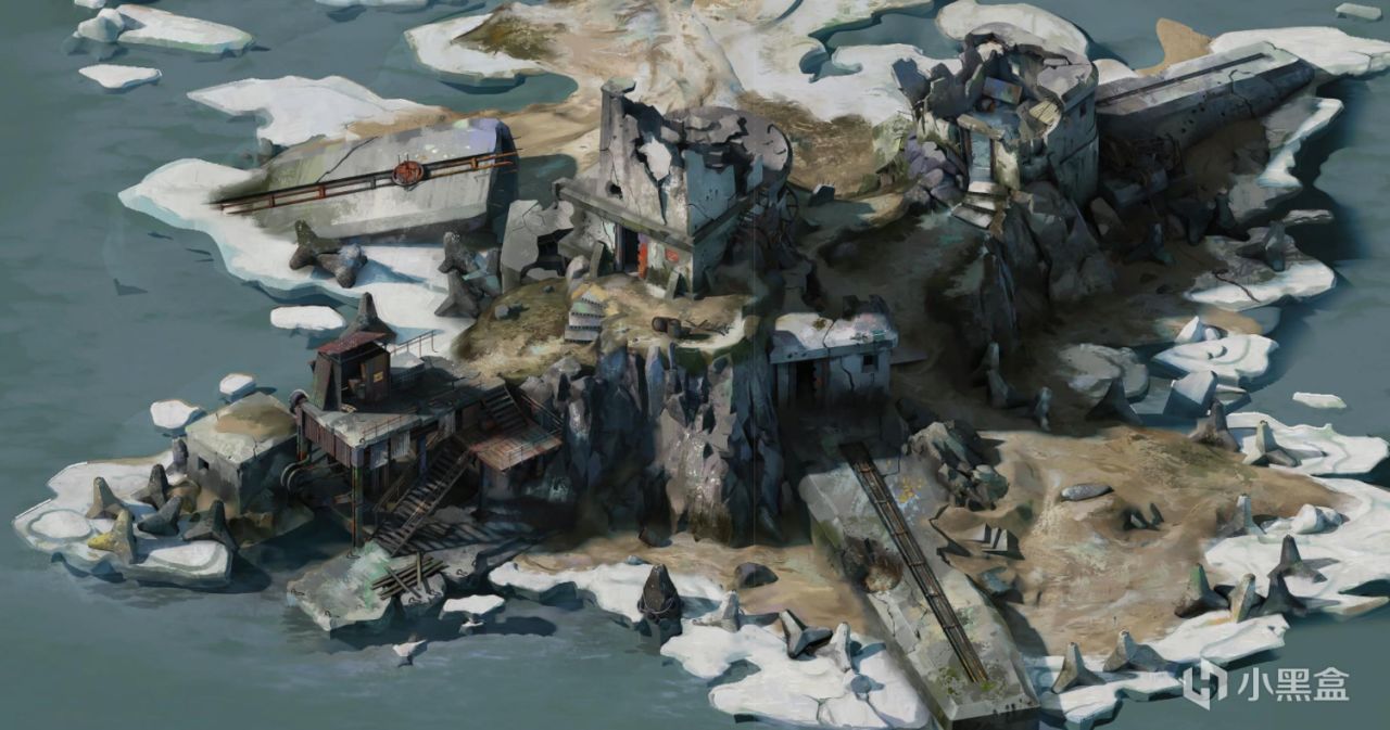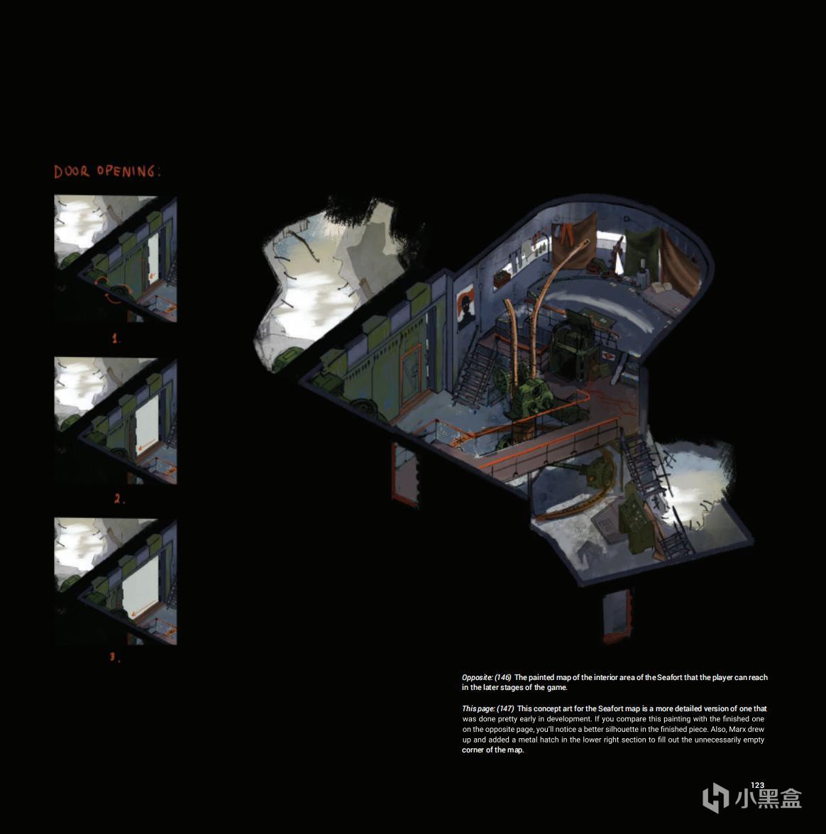 這幅《海堡》地圖的概念藝術圖是早期開發階段完成的一幅作品的更詳細版本。如果你將這幅畫與上一張圖{最終版本}進行比較,你會發現最終作品的輪廓更加清晰。此外,馬克思在地圖右下角繪製並添加了一個金屬艙門,以保證地圖上不存在空白區域。