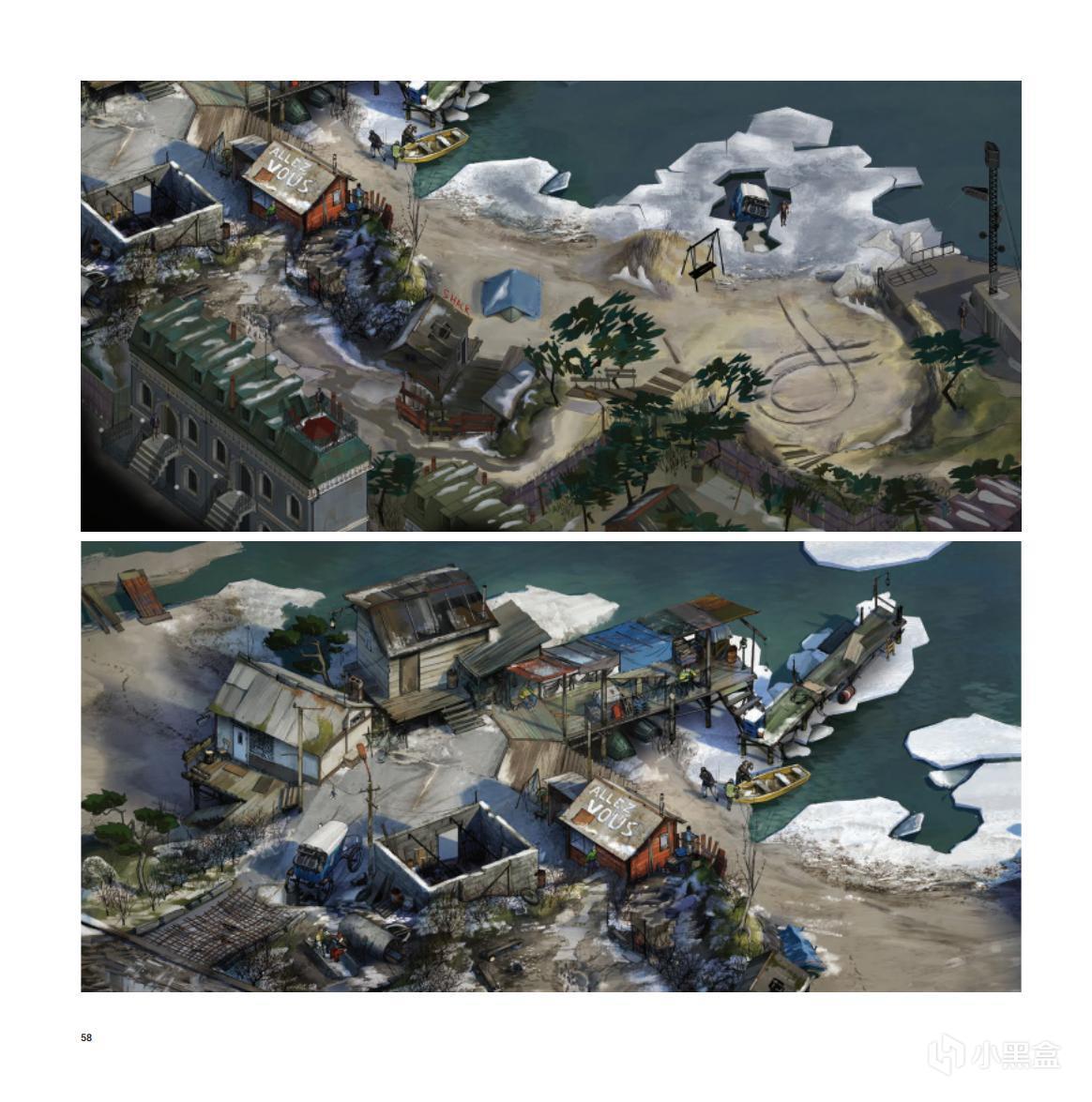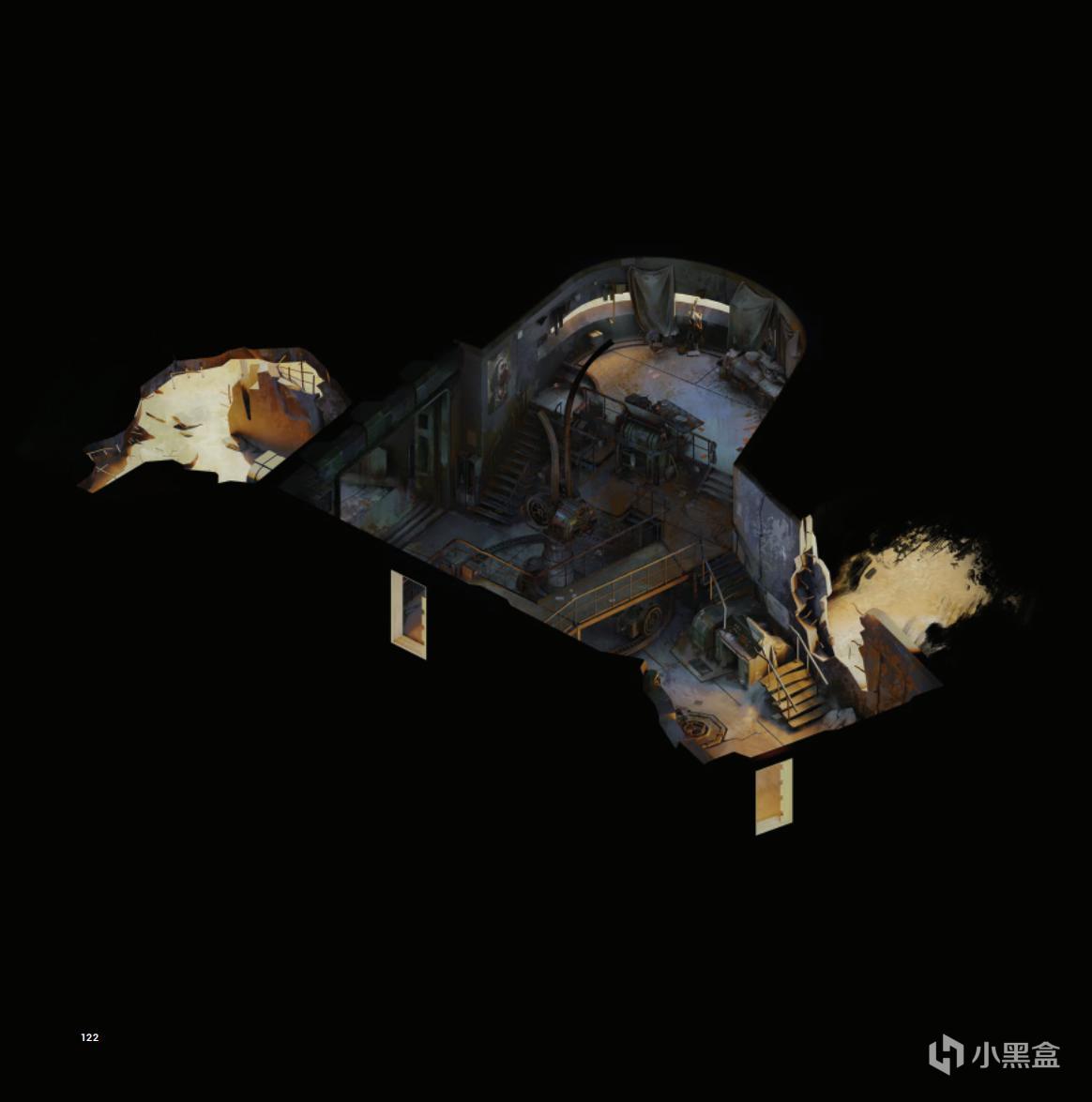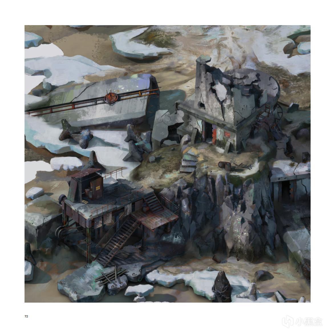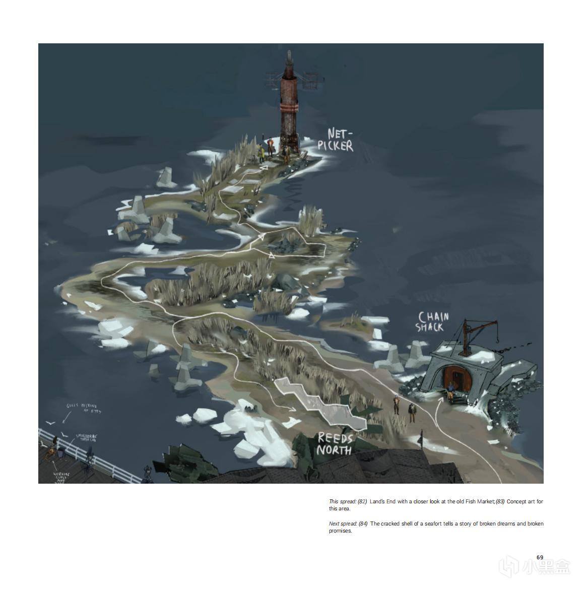這幅《海堡》地圖的概念藝術圖是早期開發階段完成的一幅作品的更詳細版本。如果你將這幅畫與上一張圖{最終版本}進行比較,你會發現最終作品的輪廓更加清晰。此外,馬克思在地圖右下角繪製並添加了一個金屬艙門,以保證地圖上不存在空白區域。