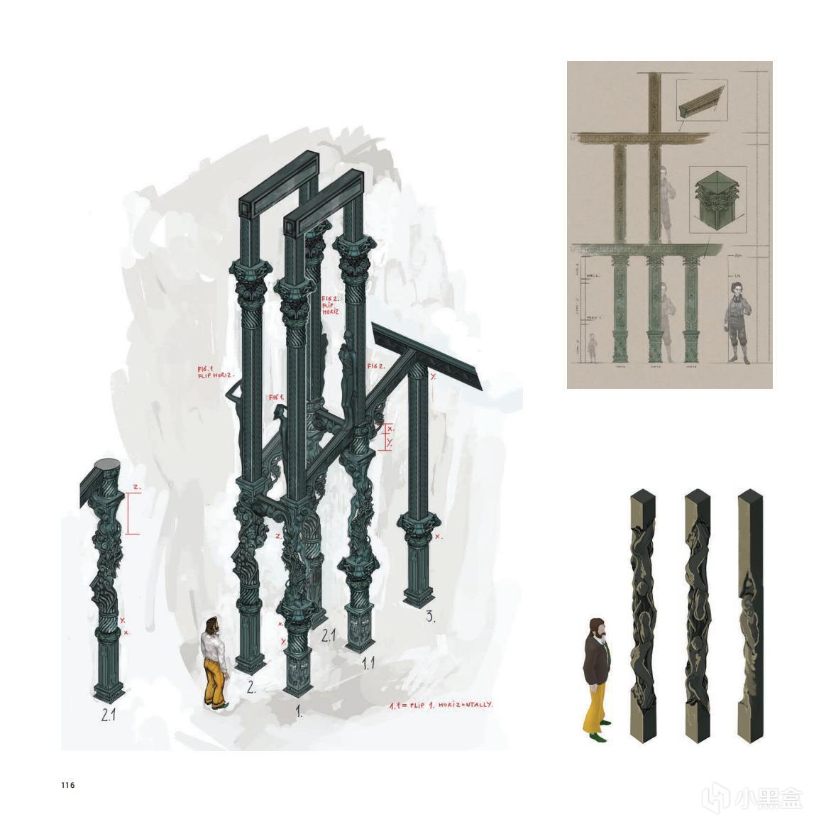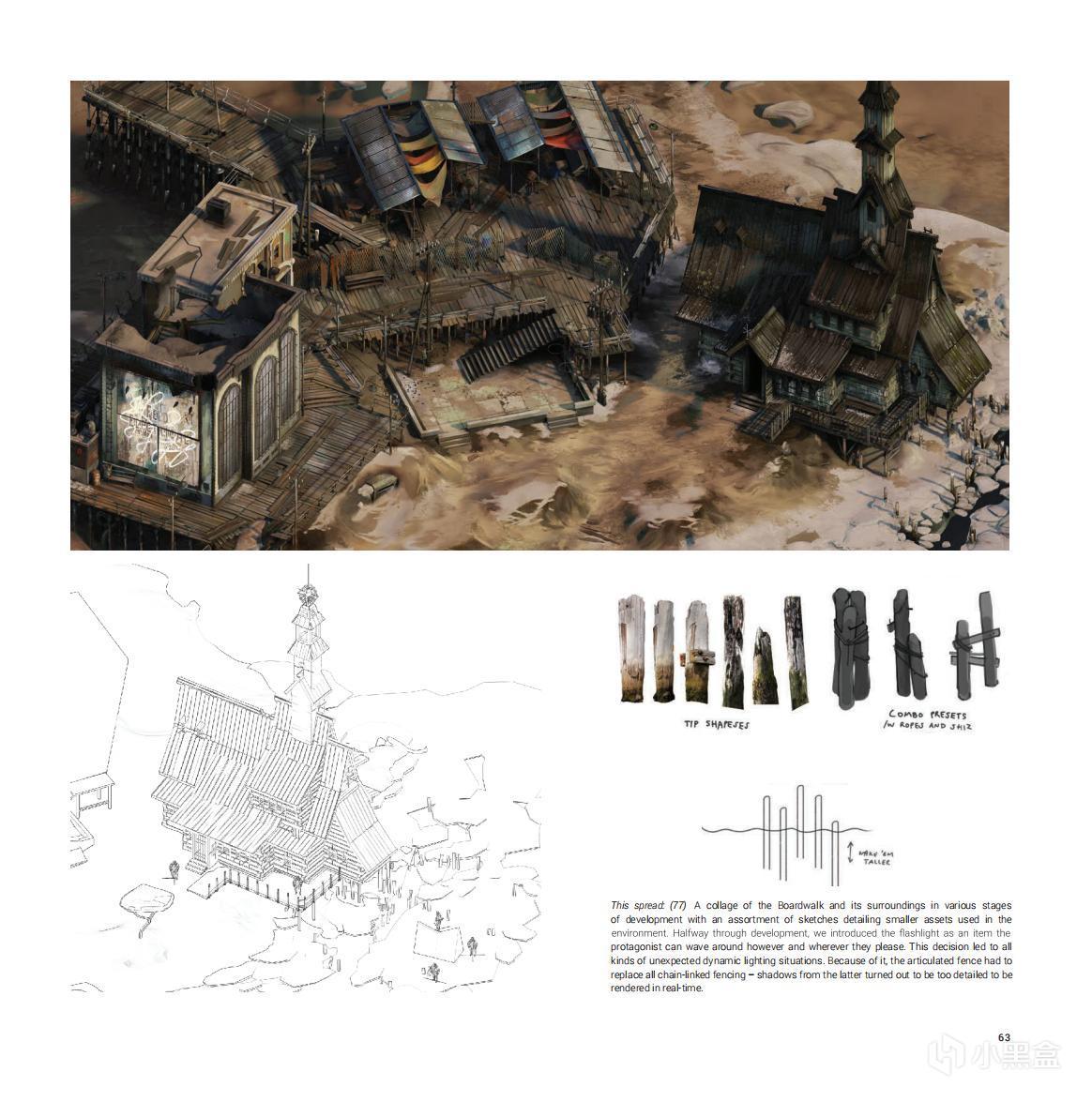 這張插圖展示了海濱步道及其周邊環境在不同開發階段的拼貼圖,其中包含了用於環境中的各種小型資產的草圖。在開發過程中,我們引入了手電筒作爲主角可以隨意揮舞的物品。這一決策導致了各種意想不到的動態照明場景。由於這一設計,原有的鏈條式圍欄陰影需要被替換爲可活動的圍欄陰影,因爲後者在實時渲染時細節過於複雜,無法流暢呈現。
