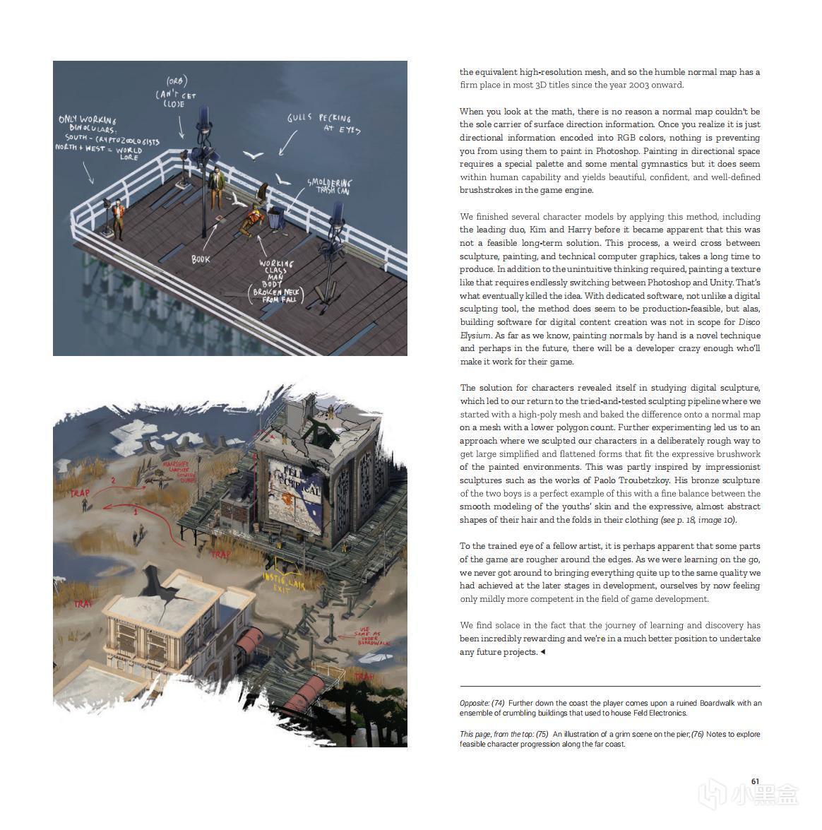 我們通過這種方法完成了多個角色模型,包括主角二人組金和哈里,但很快便意識到這並非長久之計。這一過程融合了雕塑、繪畫與技術性計算機圖形等多種技術,而且耗時極長。除了需要非直觀的思維方式外,繪製此類紋理還需在Photoshop和Unity之間不斷切換。正是這些因素最終扼殺了這個想法。若使用專用的軟件工具(類似於數字雕刻工具),該方法似乎具備生產可行性。然而,開發用於數字內容創作的軟件並不在《極樂迪斯科》的項目範圍之內。據我們所知,手動繪製法線圖是一種創新技術,或許未來會有開發者足夠大膽,將其應用於自己的遊戲中。