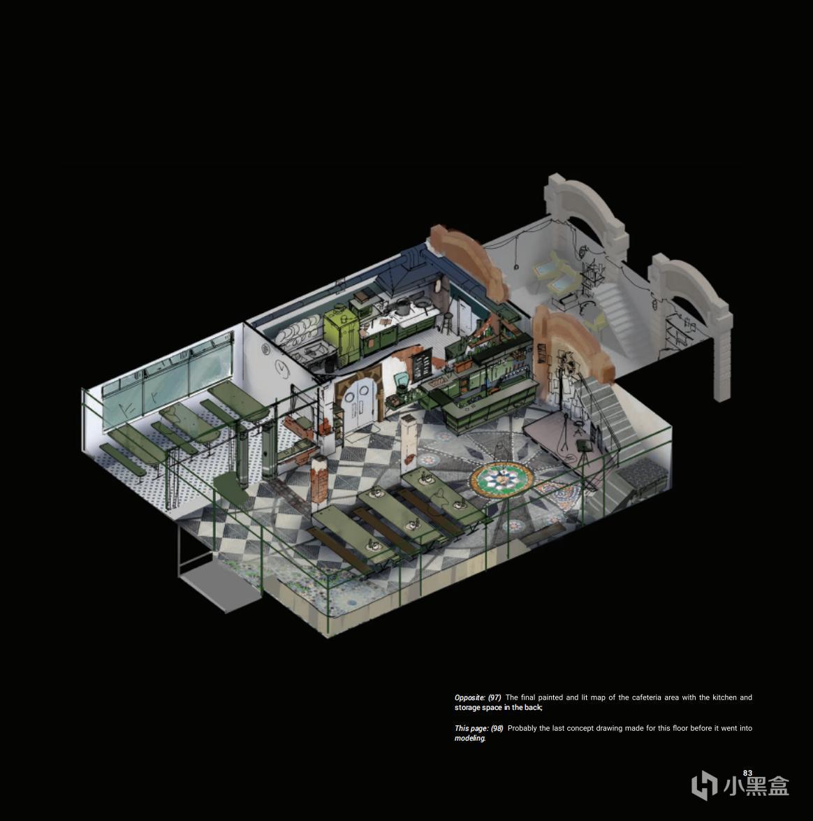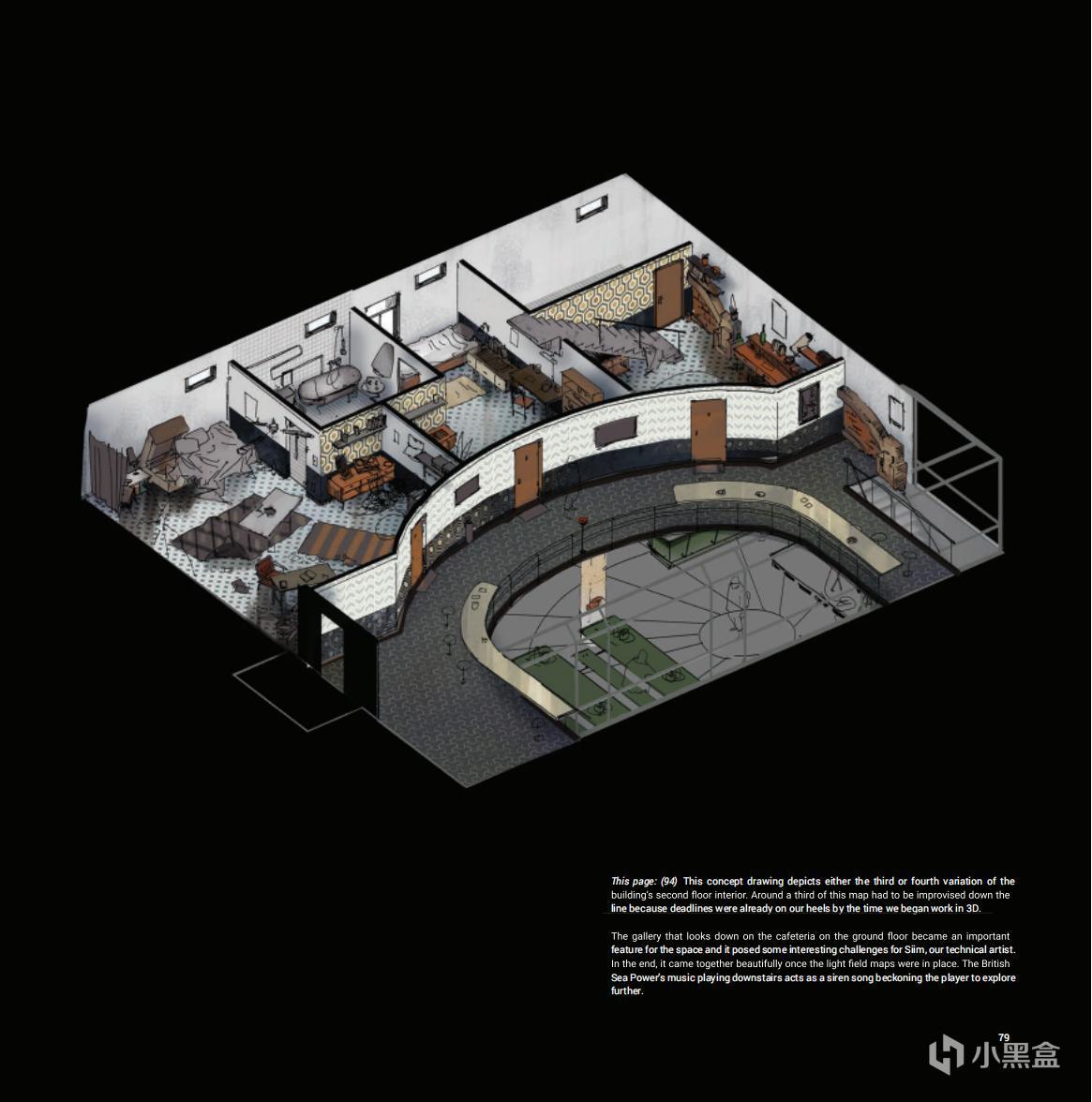 這張概念圖展示了該建築二層內部的第三或第四個版本。由於在開始3D建模時,截止日期已迫在眉睫,因此這張地圖的約三分之一部分不得不臨時調整。