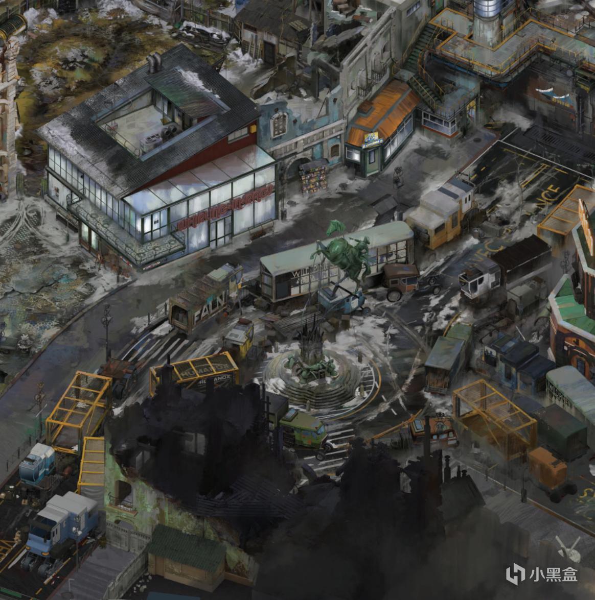 如您從這組不同階段的草圖拼貼中看到的一樣,商業大樓在概念設計階段多次經歷了擴展與收縮。地窖地圖左下角坍塌的拱門是唯一表明玩家在早期設計階段或許可以探索一條貫穿廣場下方、直達水邊炮擊坑的一條隱祕路線的線索。