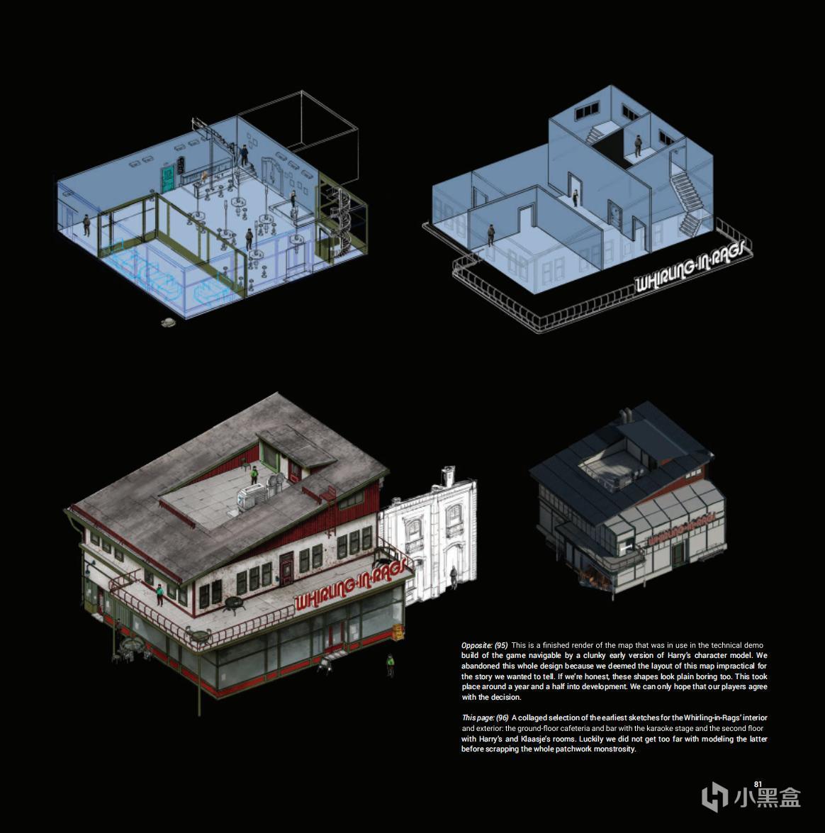 《襤褸飛旋》內部和外部的早期草圖拼貼選集:一樓的咖啡廳和酒吧,配有卡拉OK舞臺,二樓有哈里和阿斯傑的房間。幸運的是,我們在對後者進行建模之前就放棄了這一整個都是拼湊而成的怪獸設計。