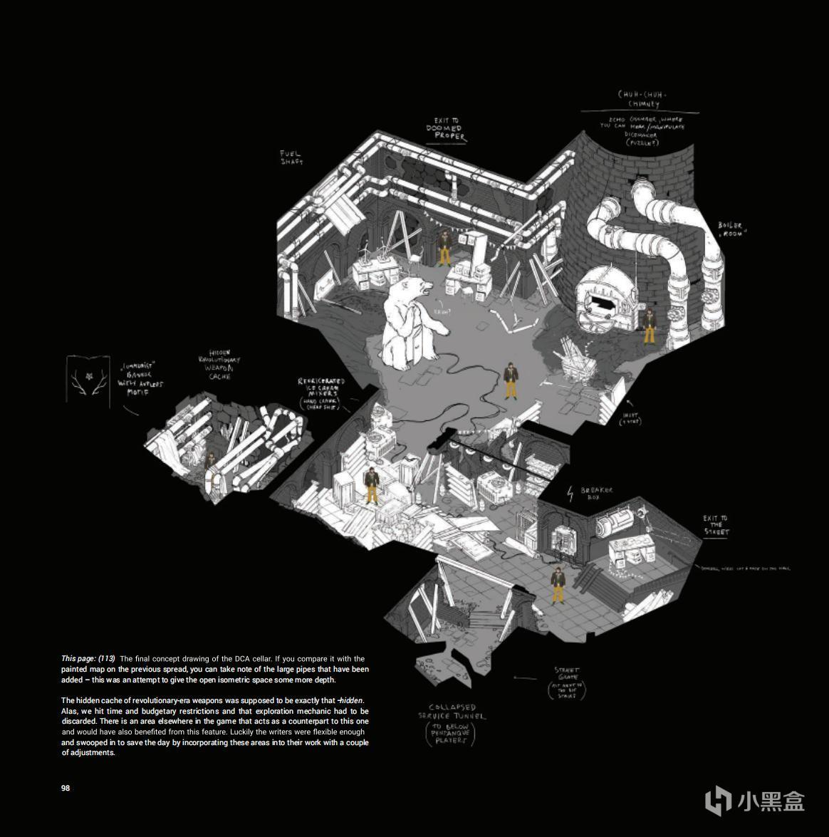 末日商業酒大樓酒窖的最終概念圖。若將其與前一頁的繪製地圖進行對比,可注意到新增的大型管道——此舉旨在爲開放的等軸測空間增添更多層次感。