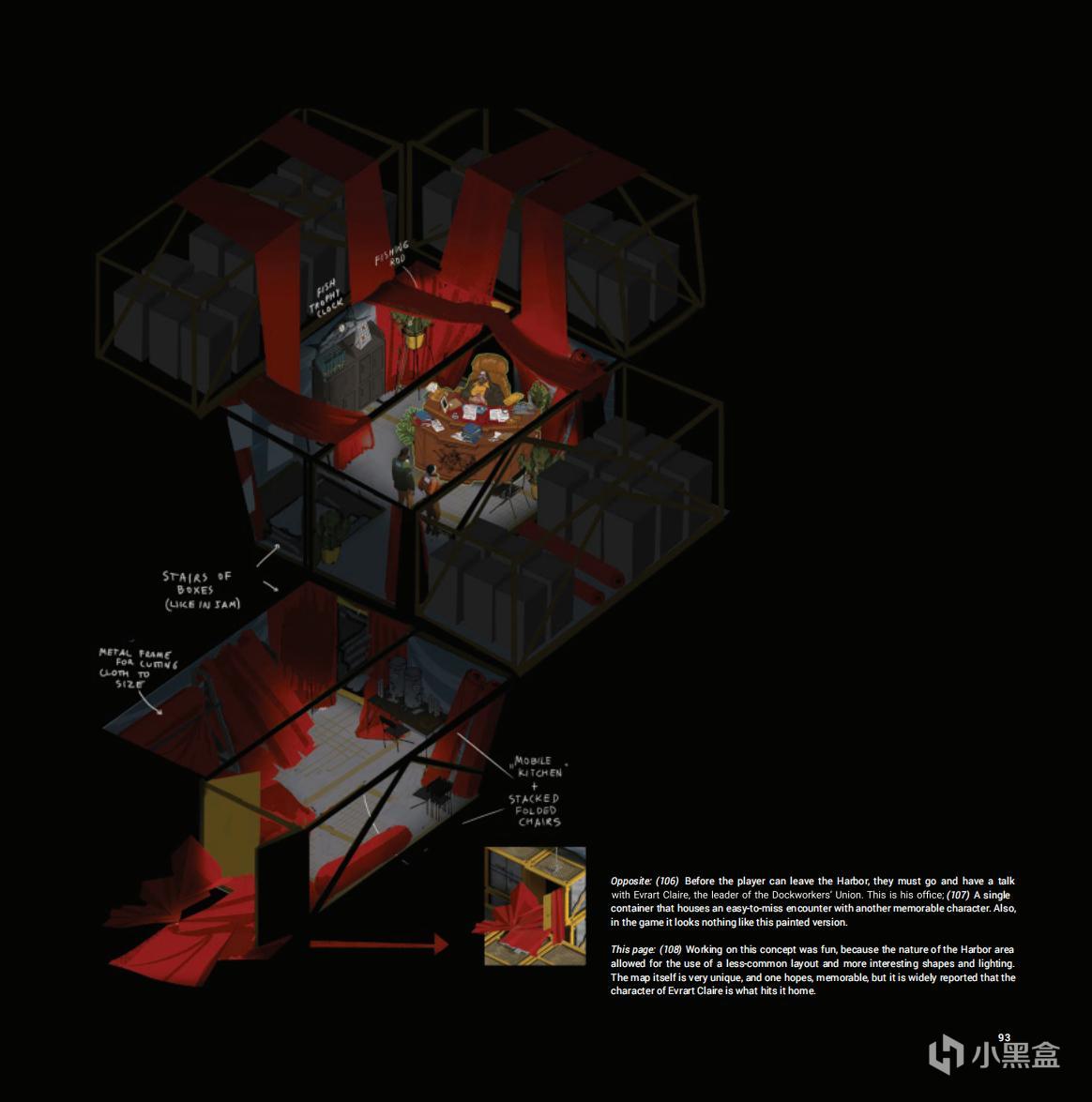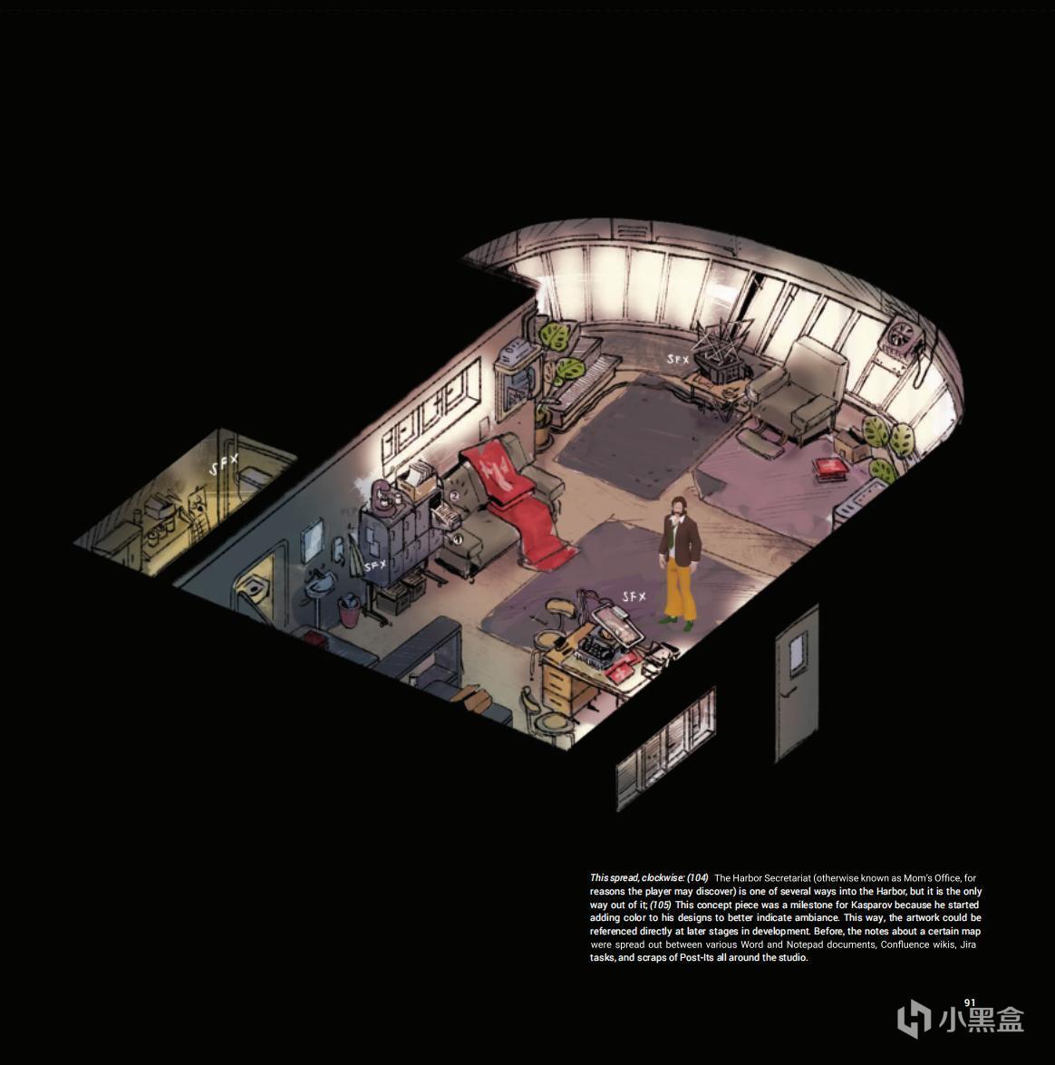 港口祕書處是進入港口的幾個方式之一,也是唯一一個離開港口的方式; 這幅概念圖對卡斯帕羅夫來說是一個里程碑,因爲他開始在設計中加入顏色以更好地營造氛圍。這樣藝術作品就可以在開發後期直接被引用。