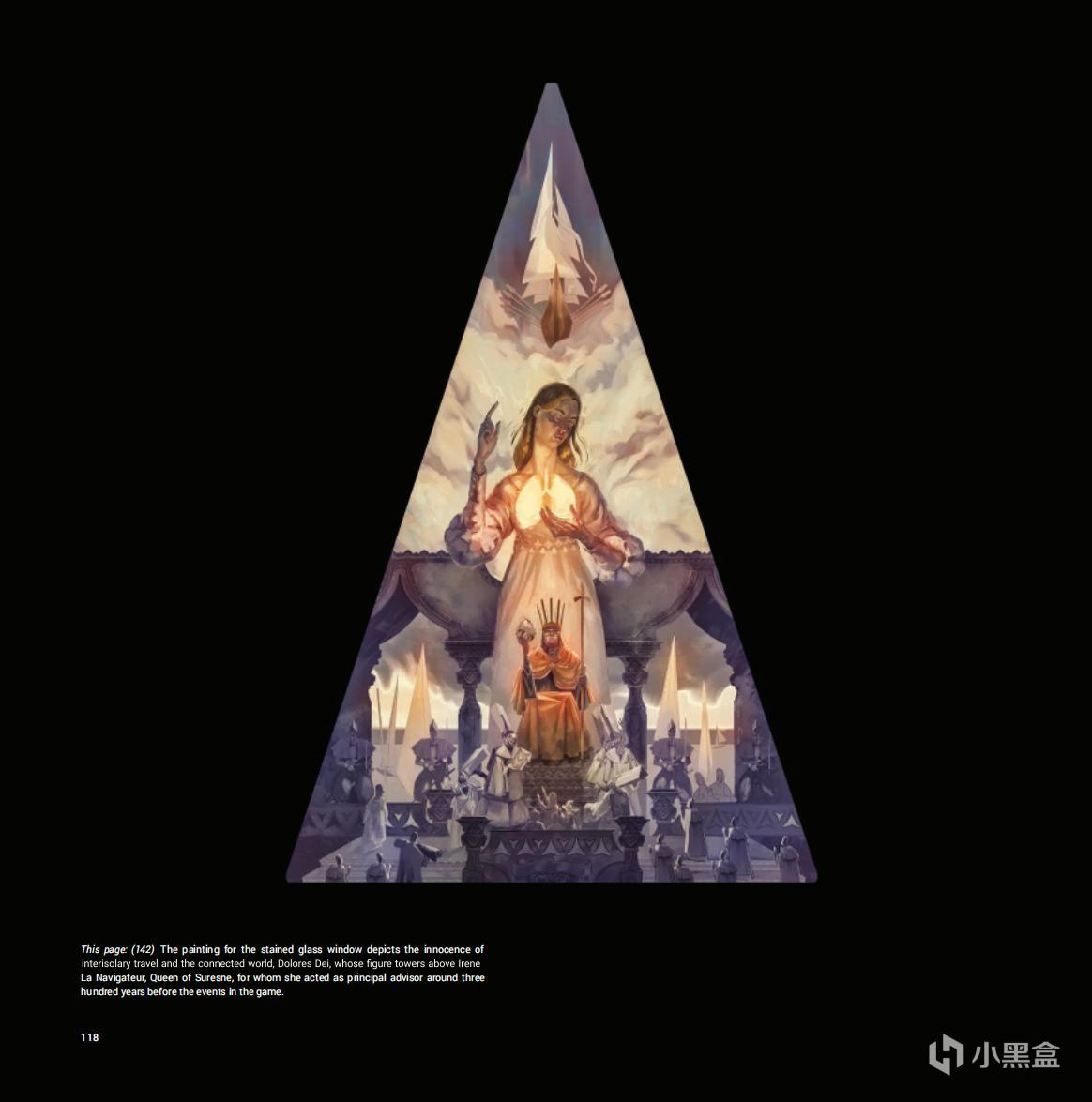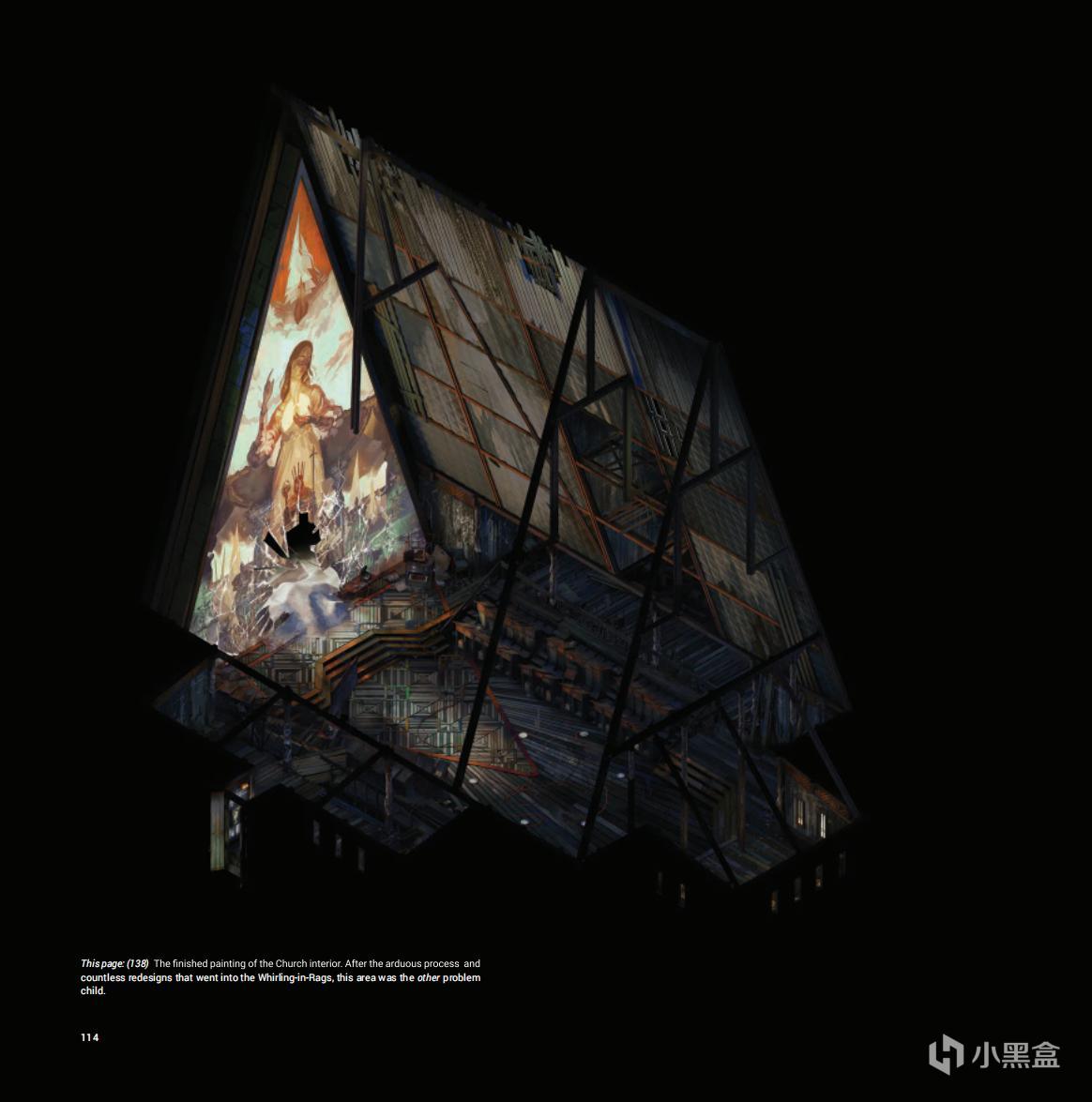 窗戶和教堂內部的各種設計概念的拼貼。教堂的設計之所以耗時如此之久,是因爲作家們在設計的同時還在處理故事部分。 例如,本頁右上角的圖像描繪的是純真的索拉,而非多洛雷斯·德伊。下方三幅圖像爲概念草圖,我們試圖通過這些草圖確定教堂的獨特風格。儘管卡斯帕羅夫對最終結果仍不完全滿意,但羅斯托夫的繪畫作品卻將所有元素完美融合到了一起。