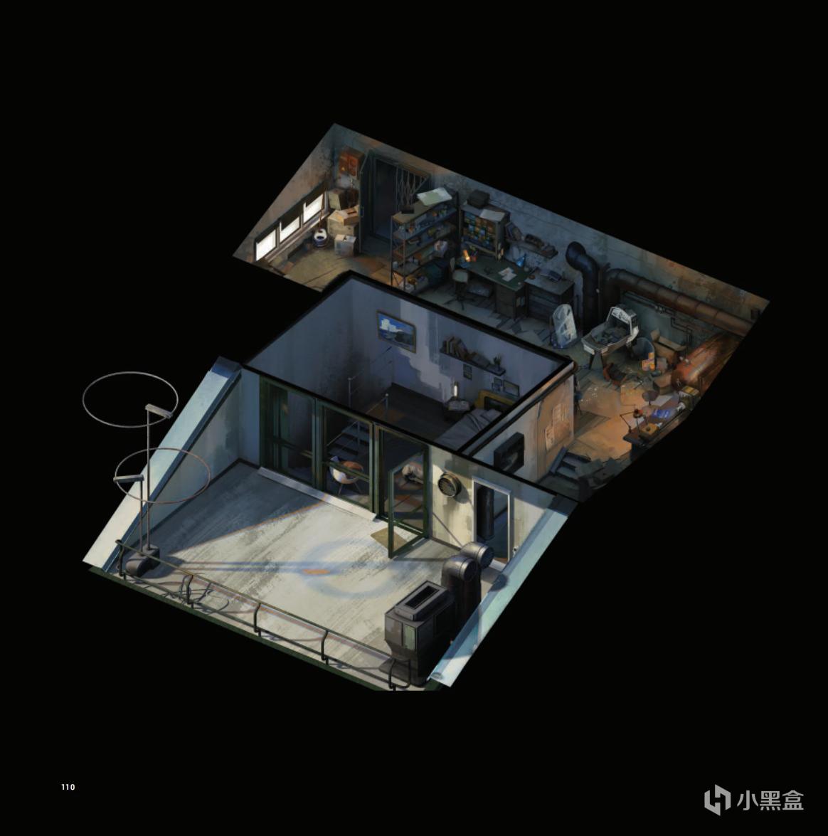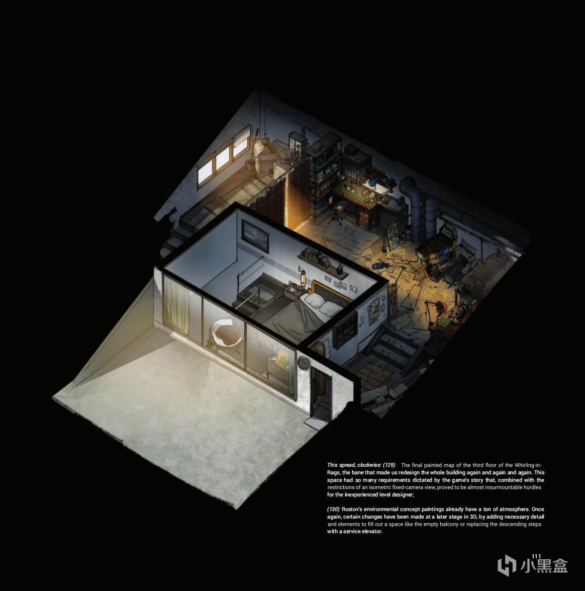 羅斯托夫的環境概念畫作已經充滿了濃厚的氛圍。在後續的3D製作階段,又進行了一些調整,通過添加必要的細節和元素來填充空間,例如空蕩的陽臺,或是將下行的樓梯替換爲電梯。