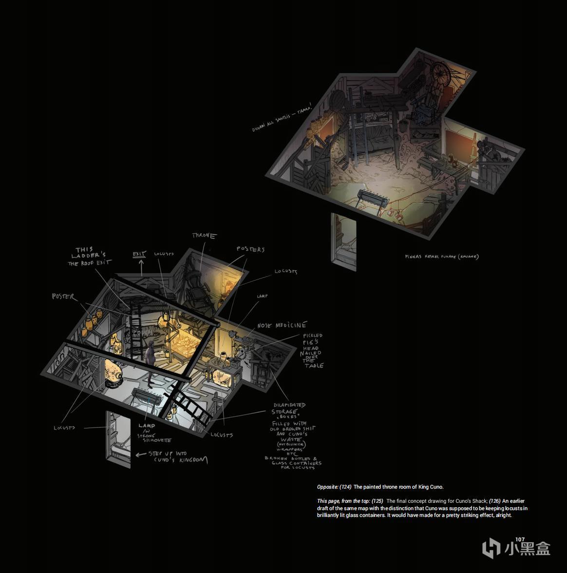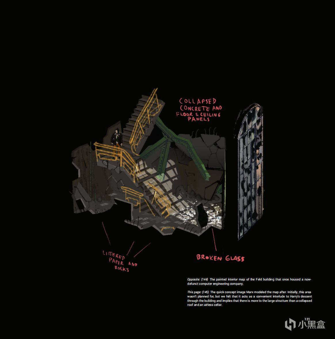 馬克思根據這個快速概念圖製作了地圖。最初,這個區域並未被納入計劃,但我們認爲它作爲哈利穿過建築物的過渡場景非常方便,同時暗示了這座大型建築物除了坍塌的屋頂和沒有空氣的地下室外,還有更多值得探索的地方。