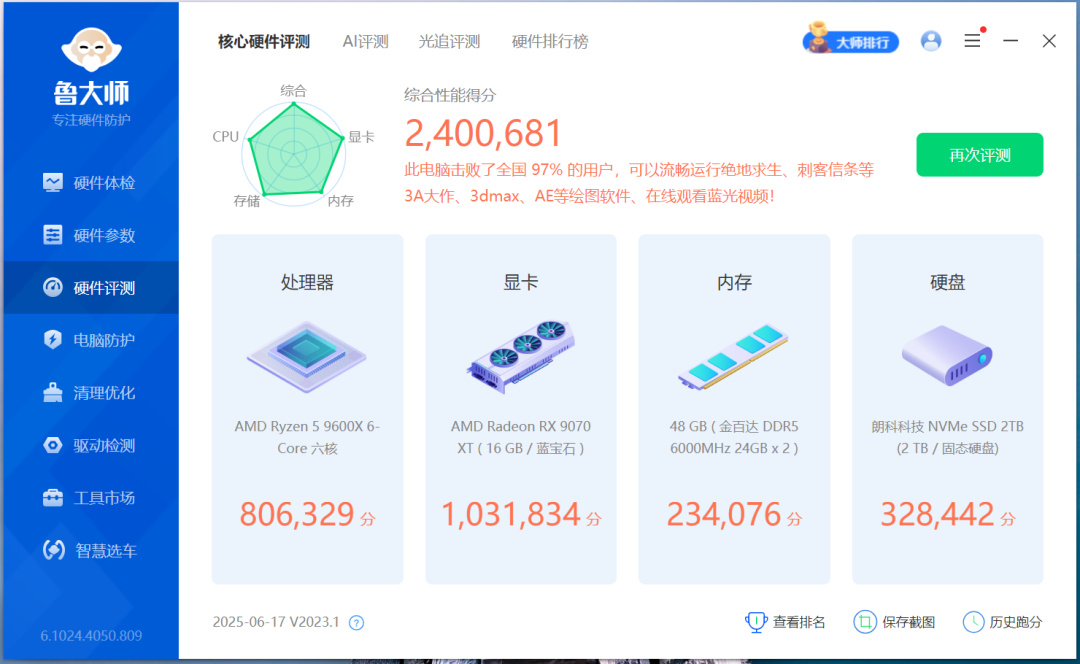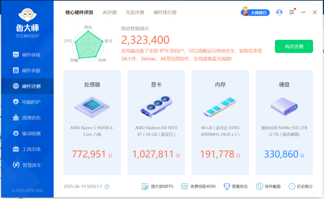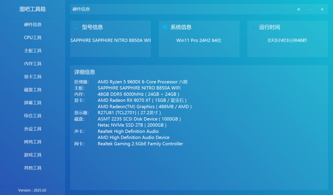 显卡使用的是蓝宝石RX 9070 XT 16G氮动,性能强悍,整机配置如下。