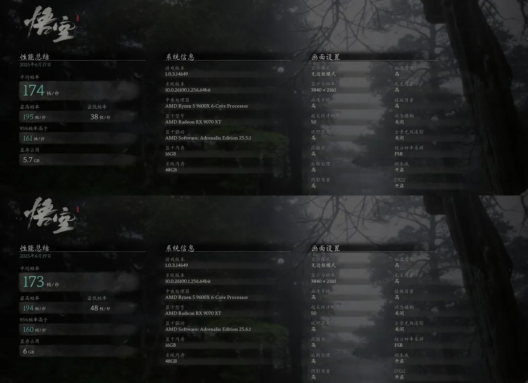 在实际游戏场景中,《黑神话·悟空》默频状态平均帧率为174,开启EXPO后平均帧率为173,相差非常小,不过最低帧率为48,相比默频下要高出10帧/秒。