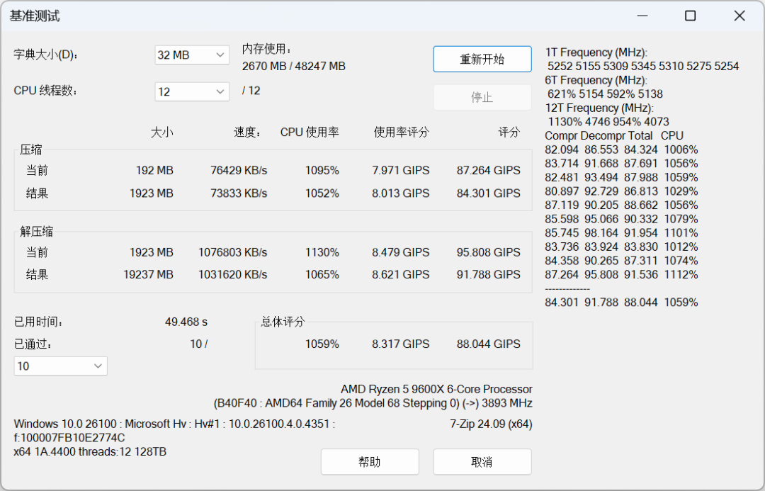 7-Zip基准测试,默频状态下压缩得分84.301GIPS,解压缩得分91.788GIPS,总体得分88.044GIPS。