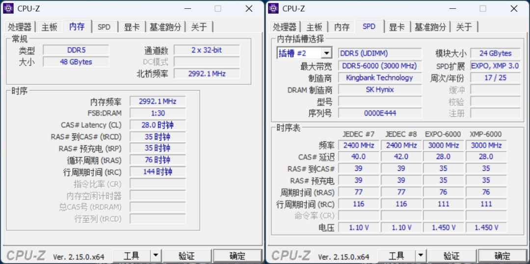 通过SPD信息可看到金百达星刃DDR5 6000 C28的DRAM制造商为海力士,预设EXPOXMP频率各一组,频率均为6000MHz,时序CL28-35-35-76,电压1.45V。
