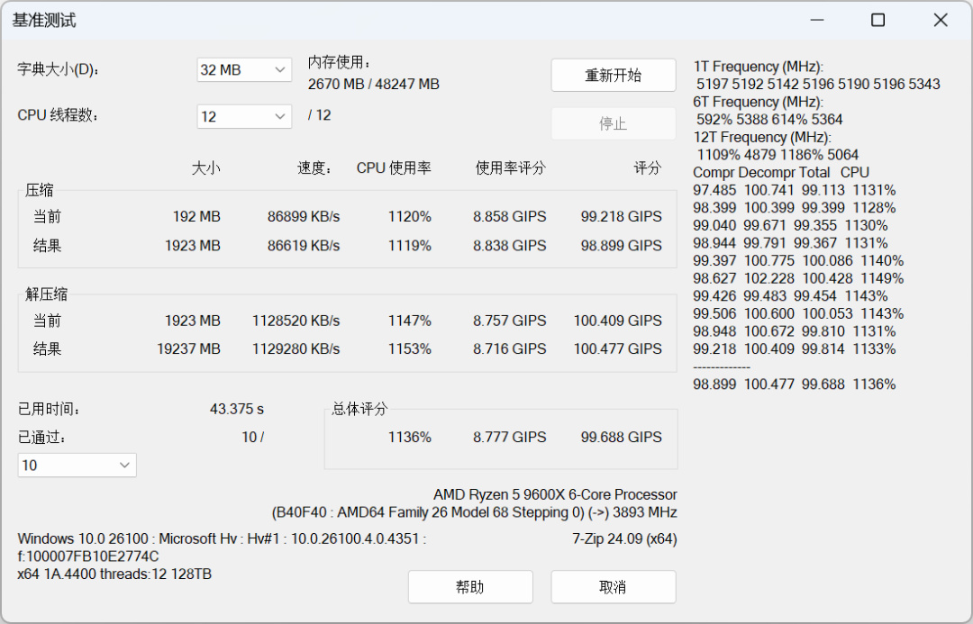继续进行基准测试,压缩得分上涨至98.899GIPS,解压缩得分为100.477GIPS,总体得分为99.688GIPS。