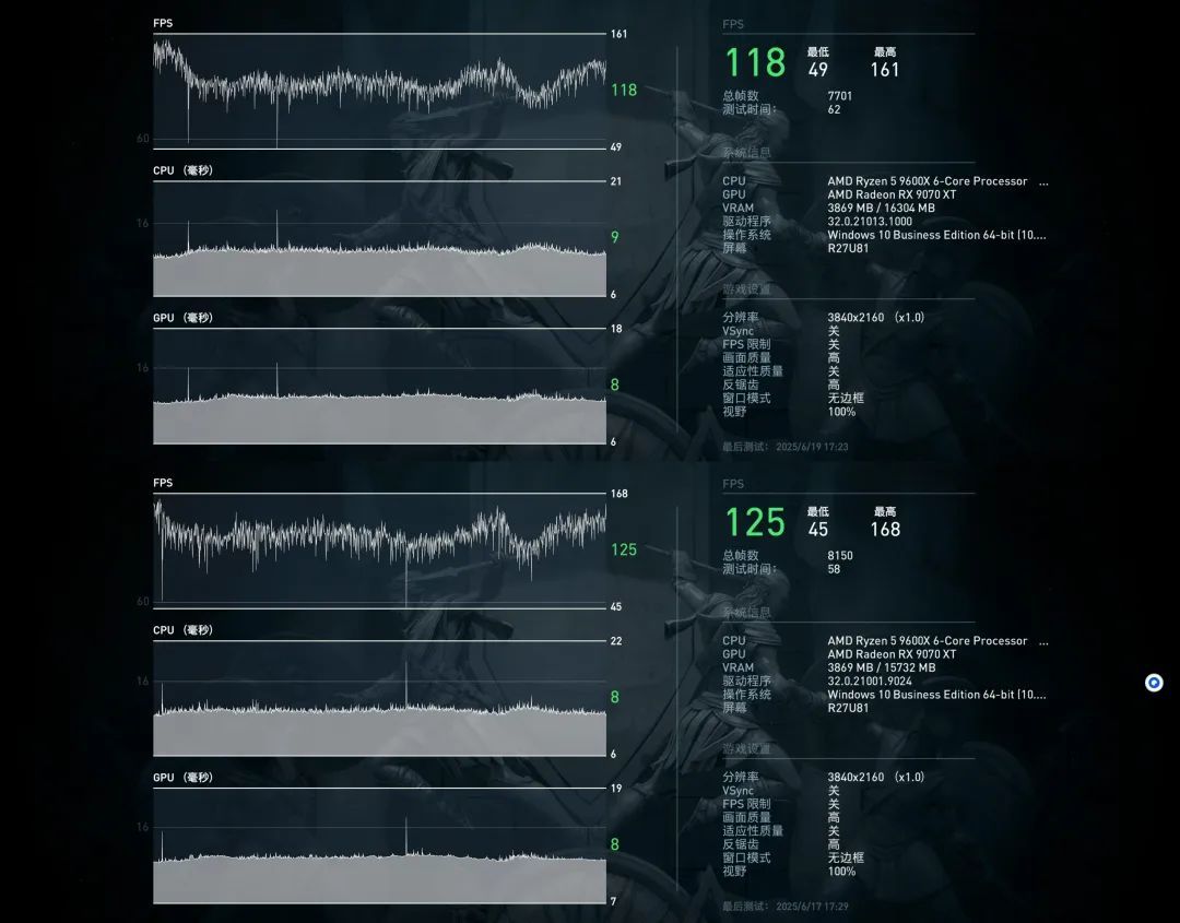 《刺客信条:奥德赛》默频下平均帧率为118,最低49,最高161;开启EXPO后平均帧率为125,最低45,最高168,有一定提升,但其实相差不是特别大,感觉是因为显卡配置比较高,所以缩小了内存性能变化带来的差距,如果是低配显卡的话对比应该会更加明显。