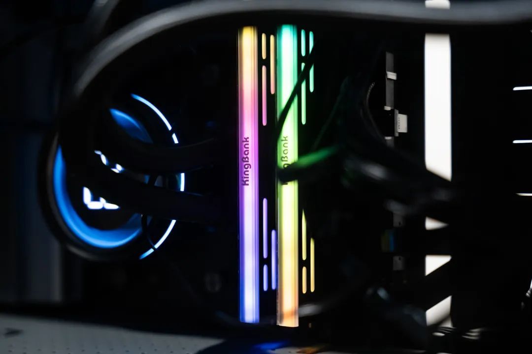 组装完成后开机,顺利点亮,可以看到金百达星刃DDR5 6000 C28的光效还是很炫的,除了背部的灯带侧边镂空发光看起来会很有特色,十分炫酷。
