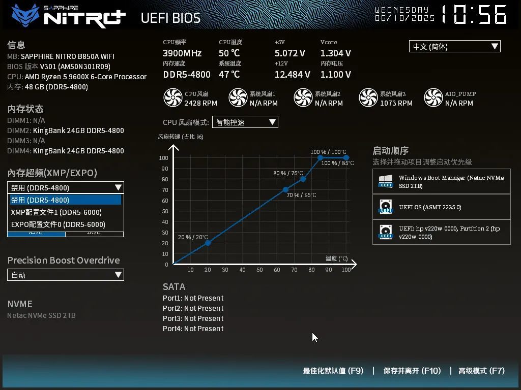 蓝宝石这款主板也支持EXPO和XMP超频配置,搭配金百达星刃DDR5 6000 C28可一键超频提升内存性能,达到厂家预设超频频率。