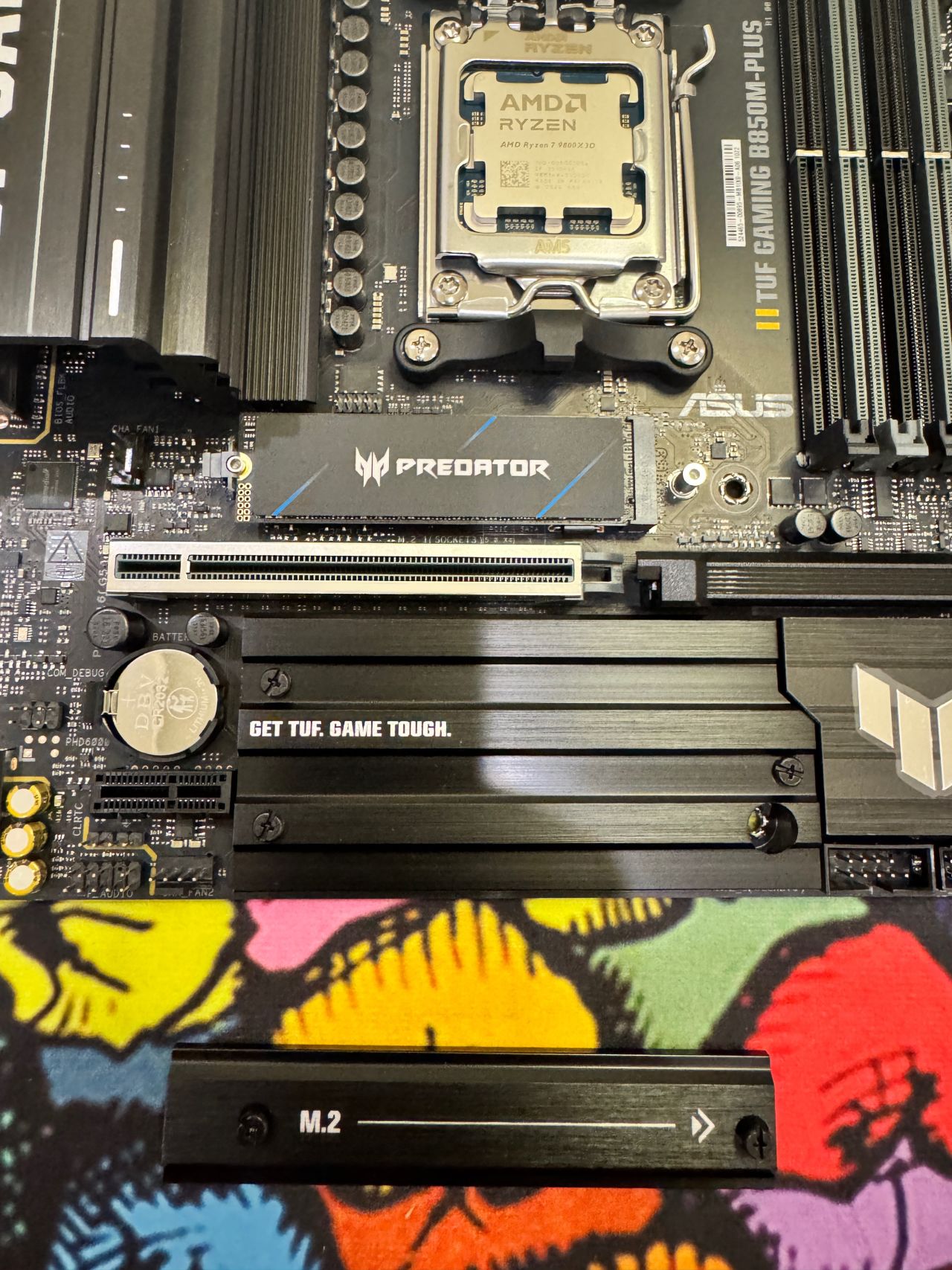 注意第二排中间的固定孔位,也就是第一条固态马甲右边的孔位,ASUS白色logo下方这个孔位,一定要扣住底部的铜柱,才算是整个主板与铜柱全部贴合,最后拧上8颗固定螺丝即可。