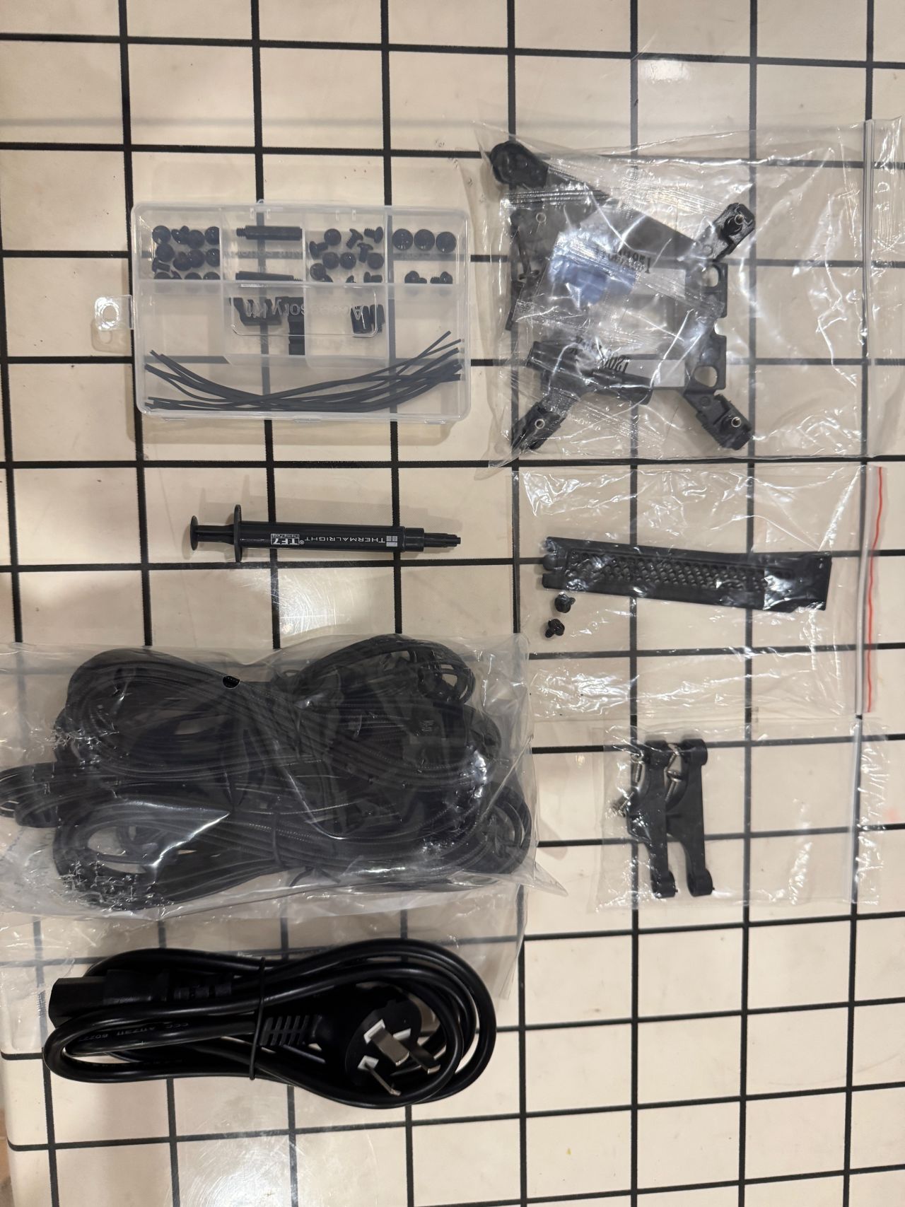 机箱剩余螺丝盒,Intel水冷扣具,剩余TF7硅脂,机箱拆下的显卡挡板,剩余的模组线,原装扣具。均放在主板盒子内。