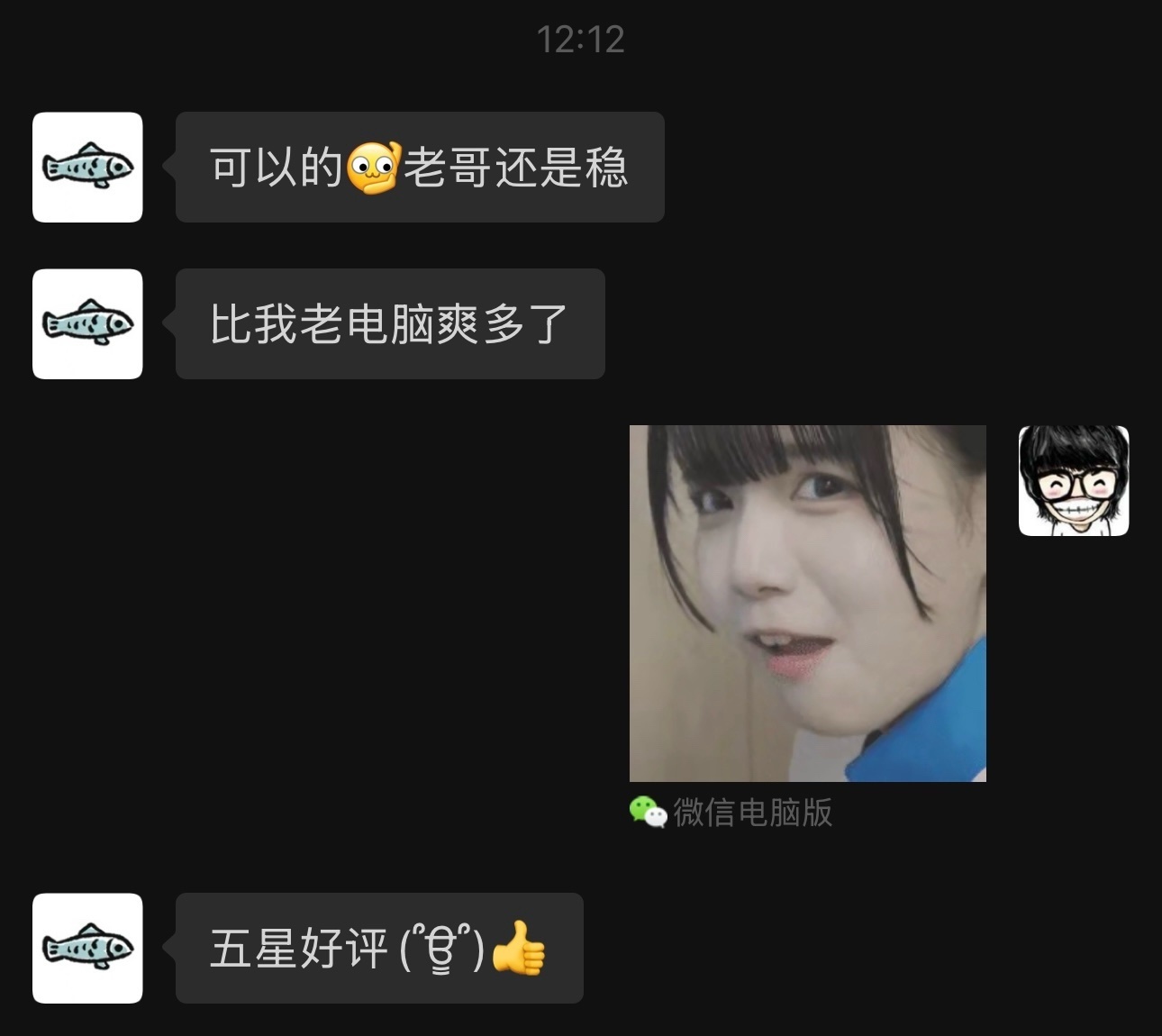 非常感谢盒友 @Alleyse 如此相信本人,简单了解一下预算与使用场景,就直接支付了全款,能相互信任也是缘分,从装机到开机直接玩的一条龙服务,我也不遗余力的给这位盒友搞的完美一些。