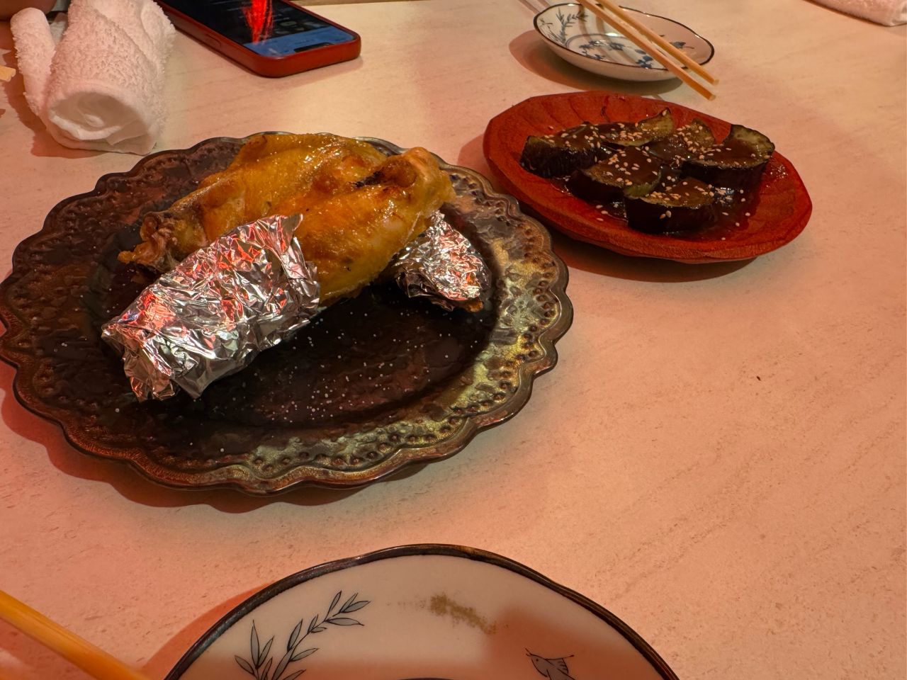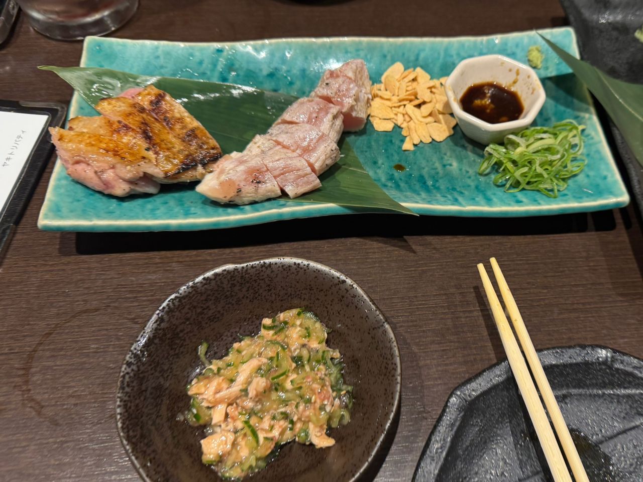 - 我直接回到民宿放下头盔就去晚饭集合地,是在tabelog上面找的一家烧鸟店,给俺们服务的小姐姐是那种带着班味的人,半死不活的感觉。不过这家店的东西吃起来还是不错的,这个小凉菜很棒。