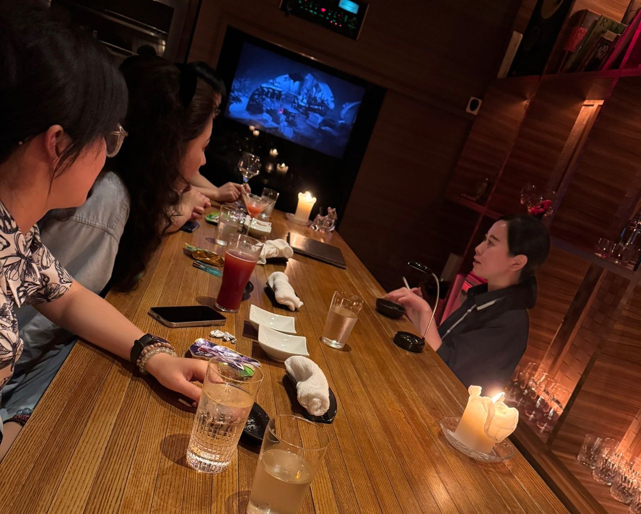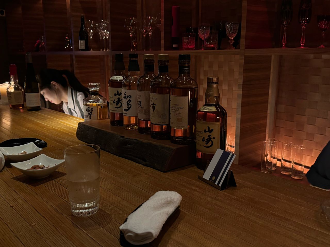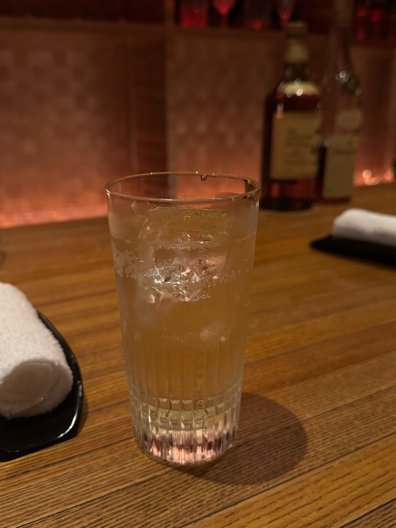 - 这次还是没有座位,我们就去了二楼的包厢,跟ktv一样的那种包厢,不过里面的样子很干净朴素,感觉比较舒服,没有那么花里胡哨的。有中文歌曲,音响也很棒,我要了四杯水忘记给我上了,four mizu。今天喝的是威士忌知多。