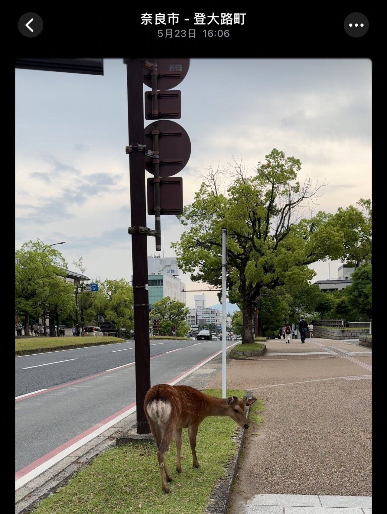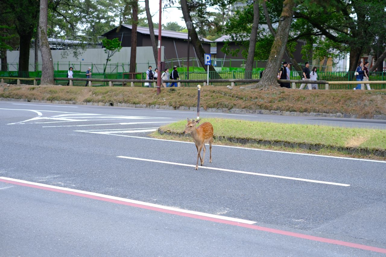 - 吃完午饭后就两点了,同行的两个人也没啥主见,纠结了一下还是去了奈良。出了车站就看到一只小鹿横穿马路,路上的车还挺多。