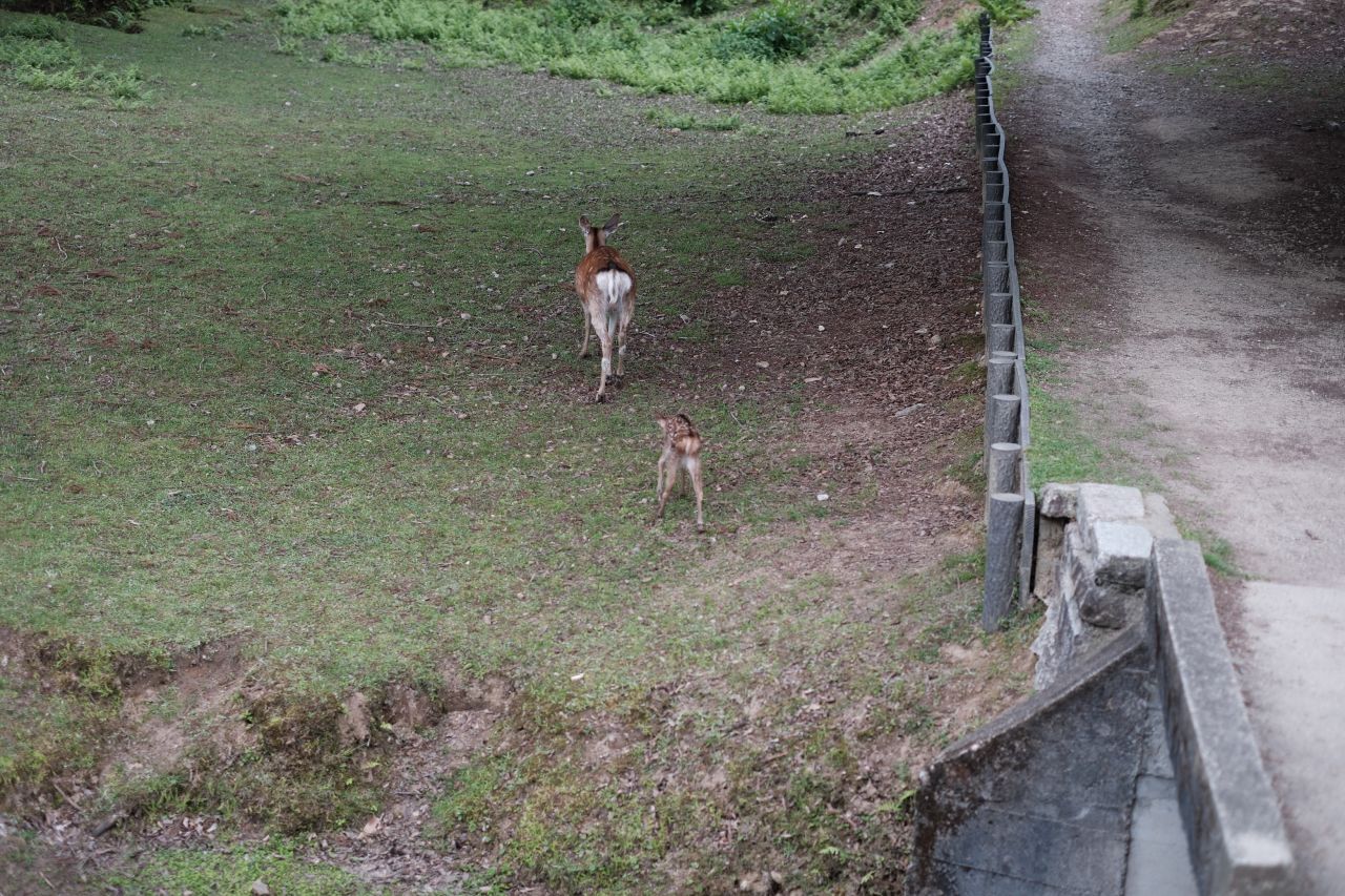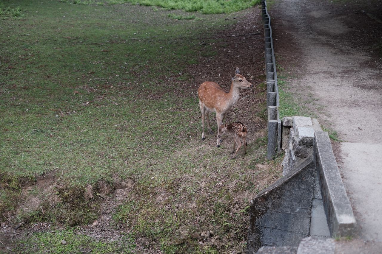 - 从东大寺出来和队友汇合,找了另一条人少的路出去,刚好碰到一只鹿妈妈在带孩子,鹿妈妈一下子跳过栏杆,小鹿着急但又无可奈何,鹿妈妈又跳回来领着小鹿走了。