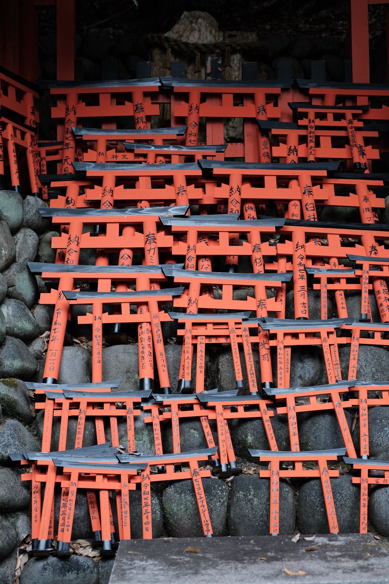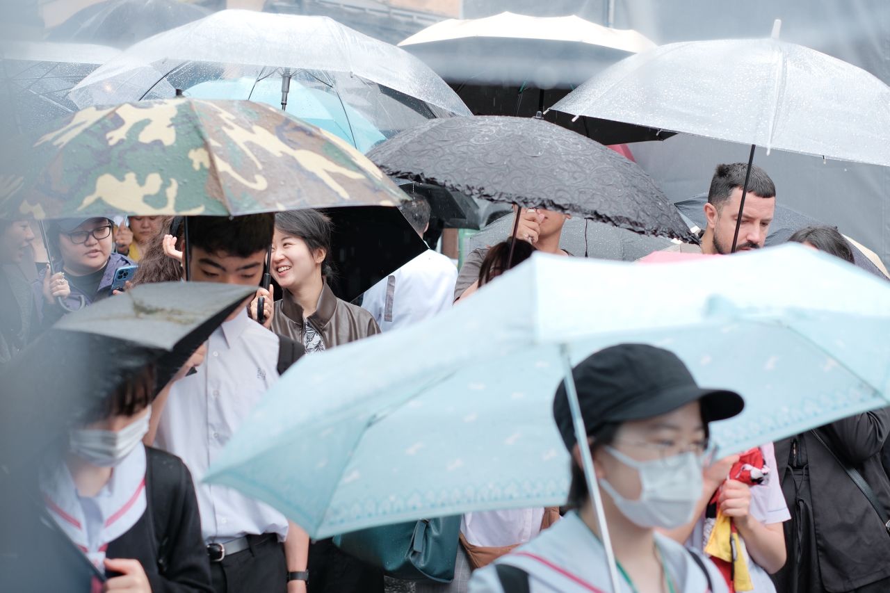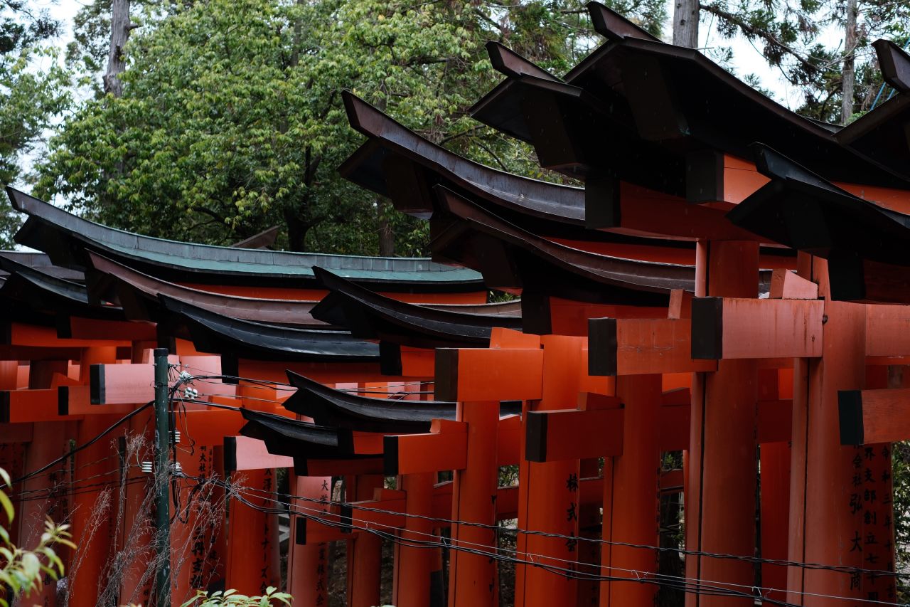 - 京都的第一站是伏见稻荷大社,出了地铁站走上几分钟就到了,鸟居超级多,在游戏里碰到过很多次,这次终于亲眼看到啦。我们稍微往上走了走,人太多了,全是雨伞,就没有继续往上走,直接下来去地铁站了。