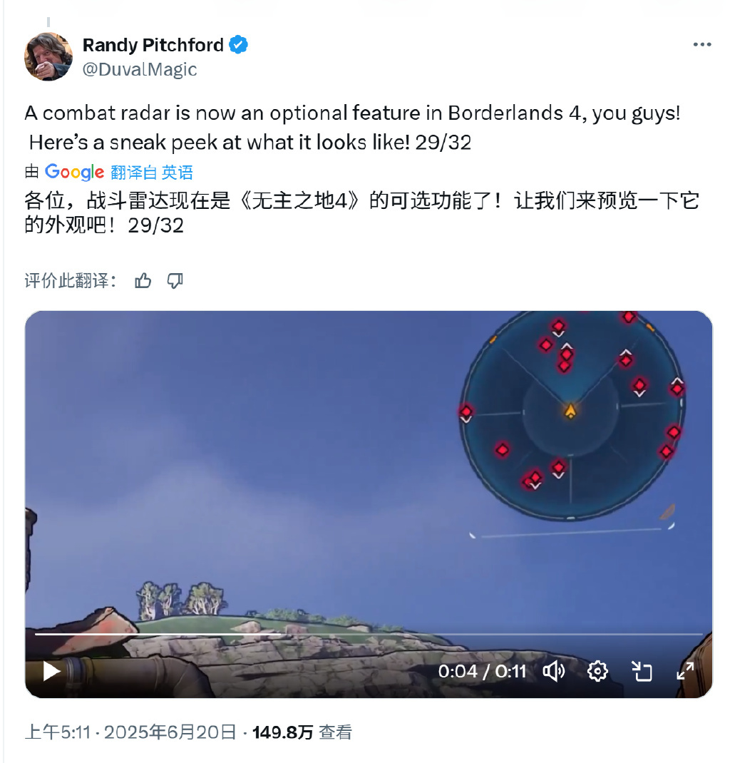 不过小地图被扣走了,取而代之的就是这个罗盘,它倒是也可以为我指引方向,但没了小地图,还是很容易成为迷途之子,总要打开大地图看两眼。不过Gearbox收到反馈之后,添加了战斗雷达功能,你可以自己决定是否开启,行吧,某种程度上来讲还挺听劝的。