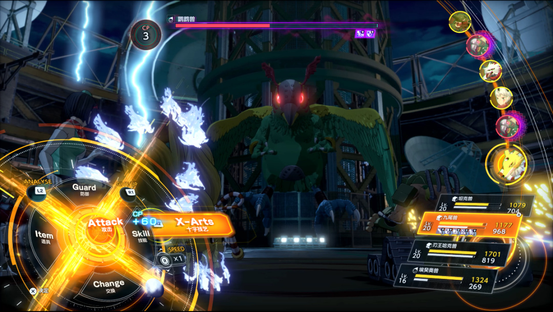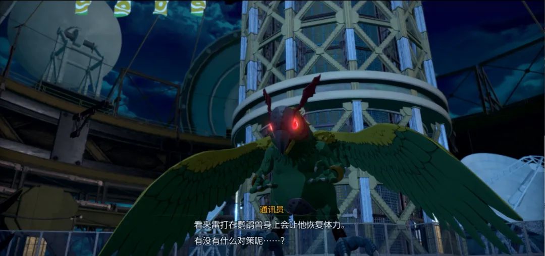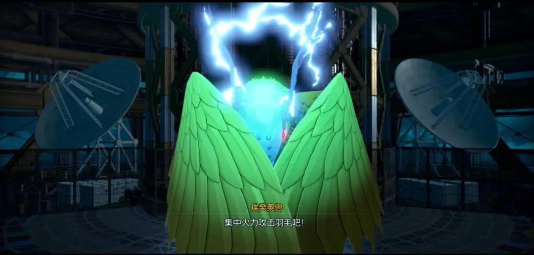 以上就是整体战斗里玩家能够体验的基础能力,从BOSS的过程来看,特殊的战斗还会有一些额外的规则,例如鹦鹉兽的战斗里,场景当中浓罩着乌云,不时会劈下来,但不是攻击玩家队伍,而是打在鹦鹉兽上为其恢复生命值——这个数码宝贝身上有一点弗兰肯斯坦的要素,被雷劈回血挺合理的。