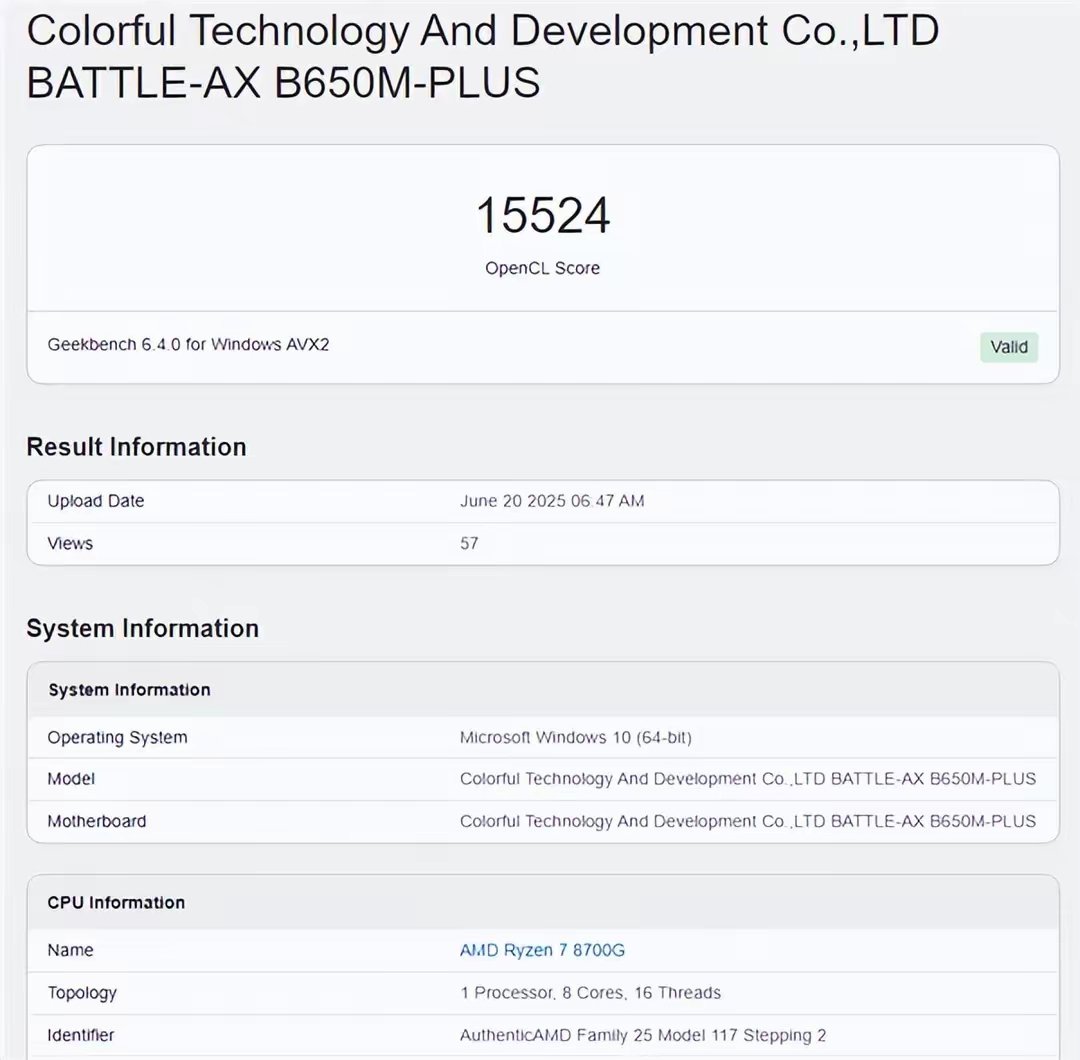 不過GeekBench跑分的結果可能並不完全準確,特別是新架構的GPU芯片,尚處於初期調試階段,因此對測試平臺的兼容性和數據精度尚未完全優化。該測試平臺使用的是銳龍7 8700G處理器,搭配64GB DDR5-4800內存和七彩虹戰斧AX B650M-PLUS主板,執行的是OpenCL通用計算測試,得分爲15524分。