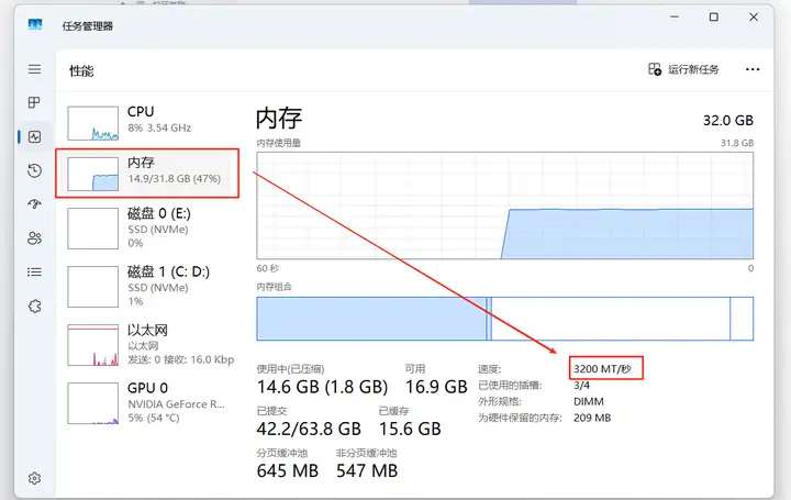 調出任務管理器後,左側找到“性能”-選中“內存”-就可以在“速度”處檢查是否跑到內存標稱頻率了: