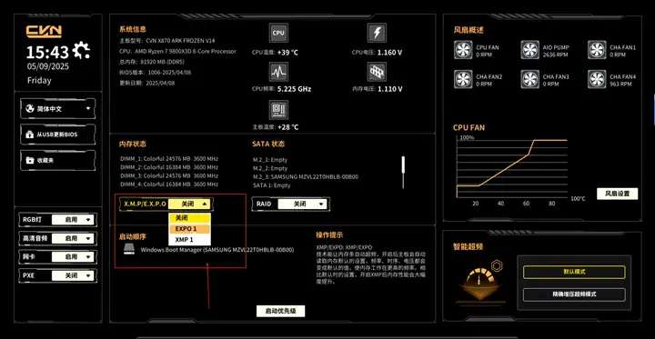 AMD主板顯示的是EXPO,和XMP意思一樣——內存自動超頻。我們可以選擇好官方的預設文件,一鍵超頻內存: