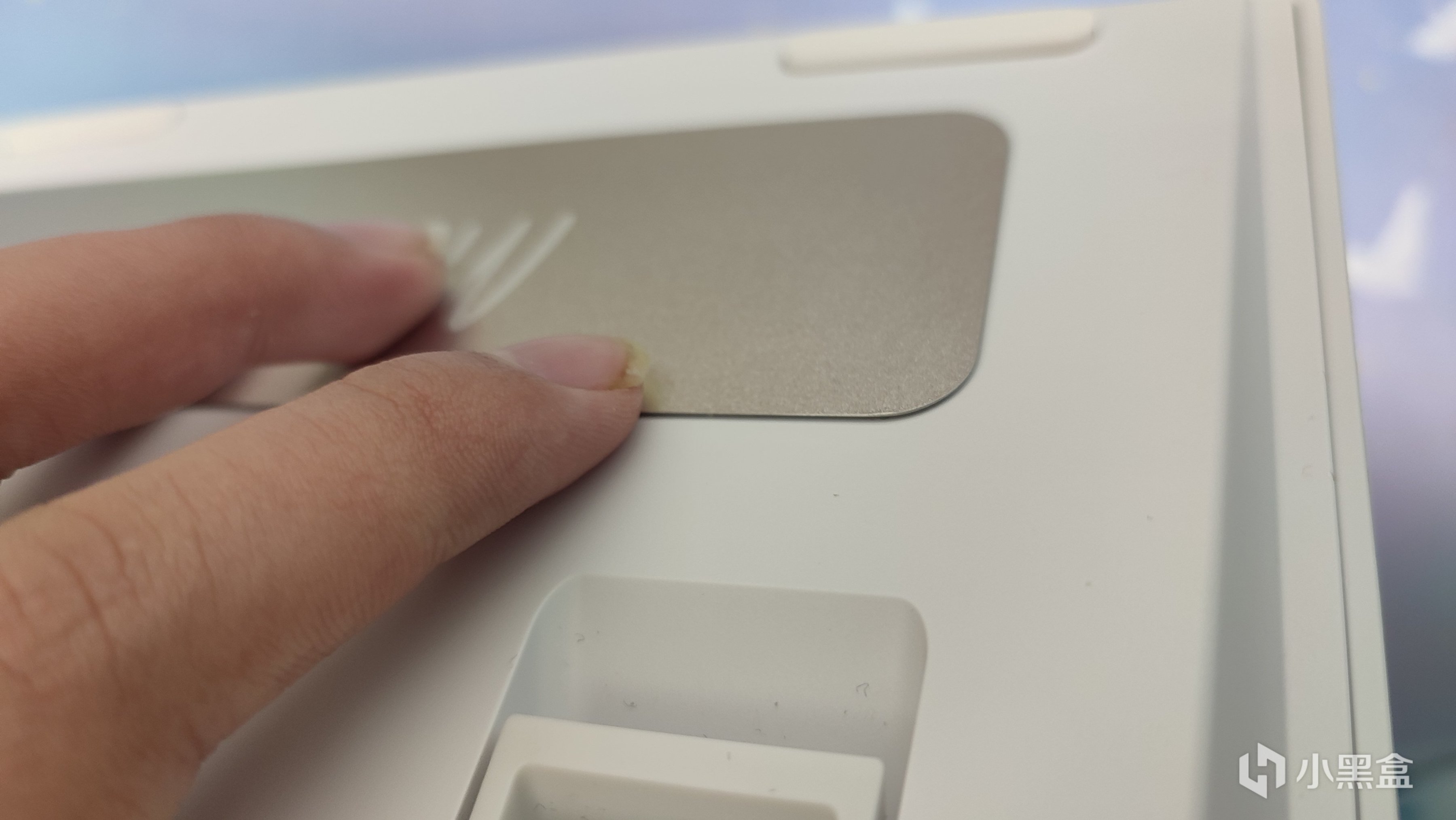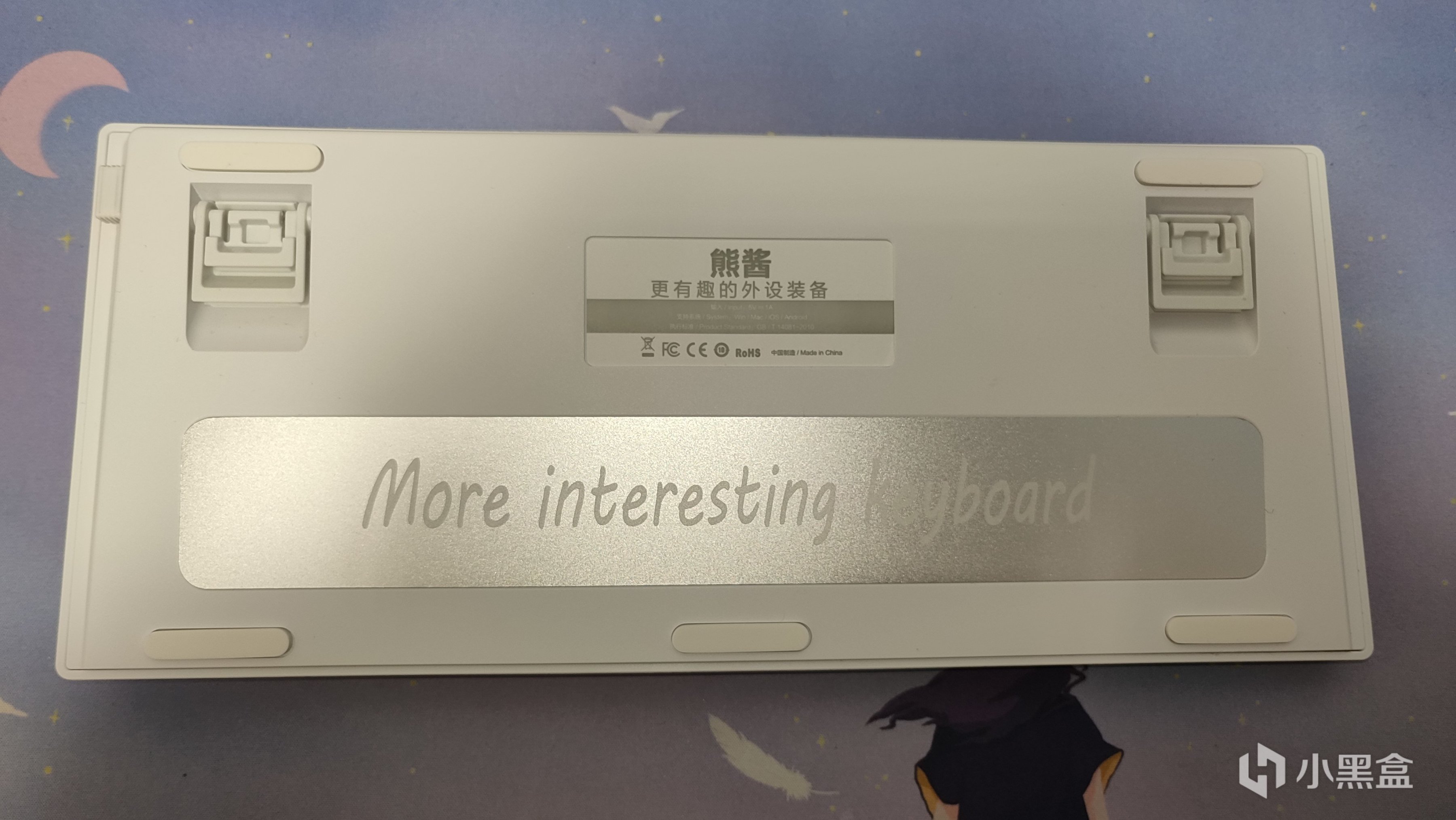 翻到背面,映入眼簾的就是底部的銘牌,上面還刻着一句話:More interesting keyboard,而翻譯則就在上面一點:更有趣的外設裝備(劃掉,改鍵盤),具體什麼材質不太清楚。