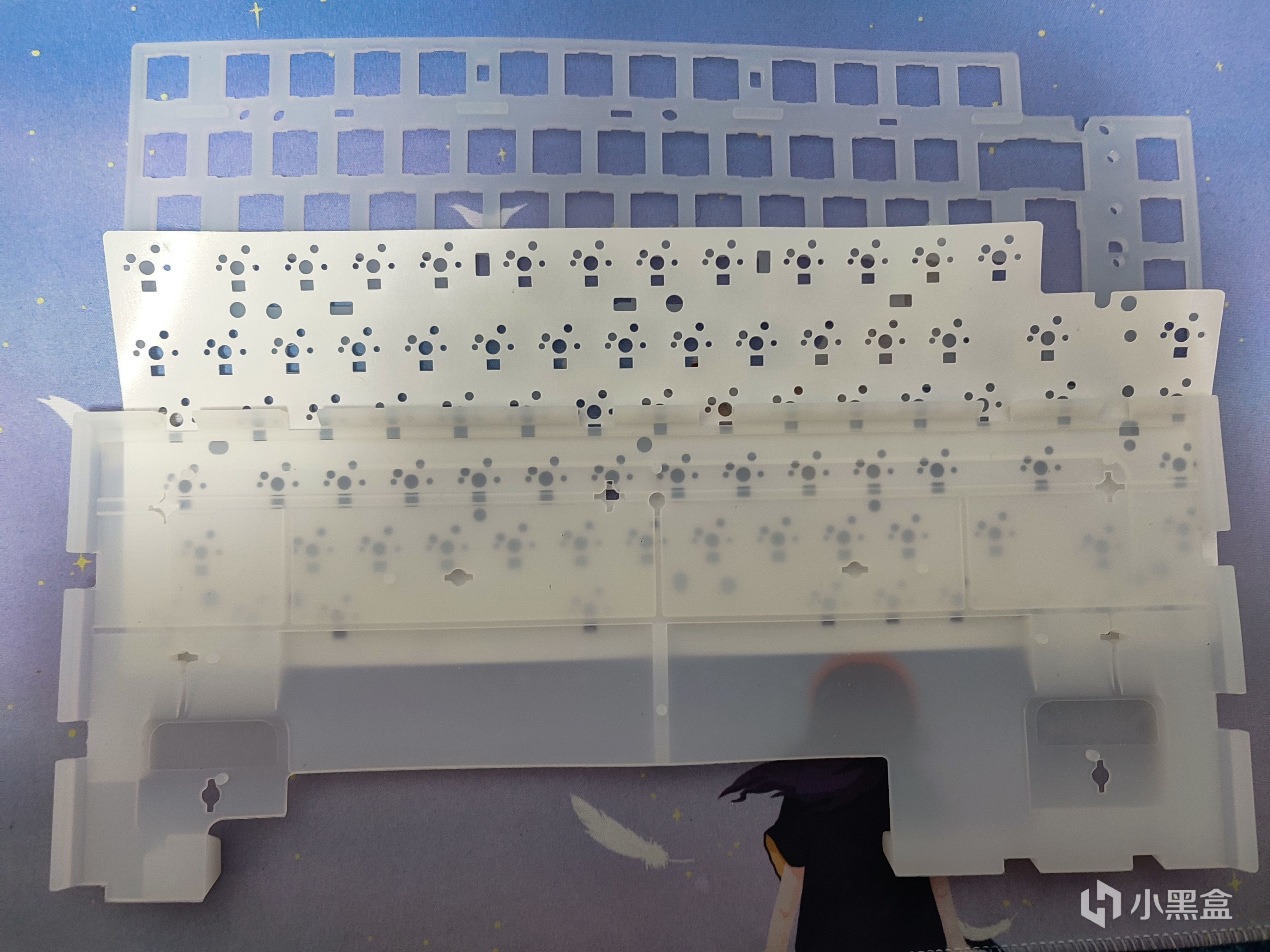 說白了就是玻璃纖維版,這種材質定位板的特點就是硬度中等,韌性十足,聲音小。作爲搭載在一把GASKET結構的鍵盤上,他的柔軟程度是要優於金屬定位板的。