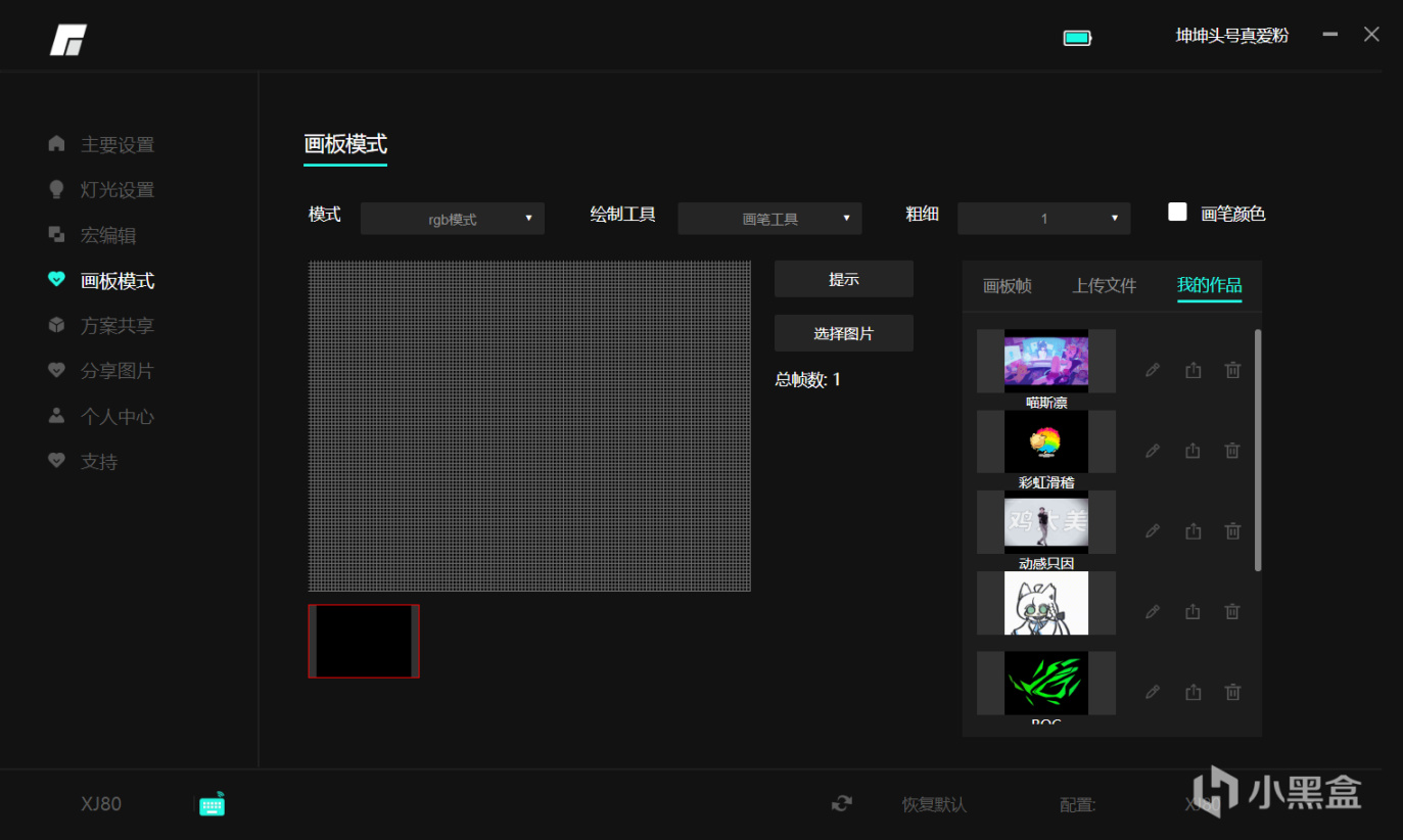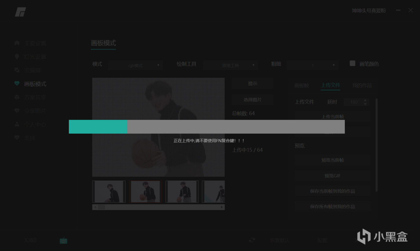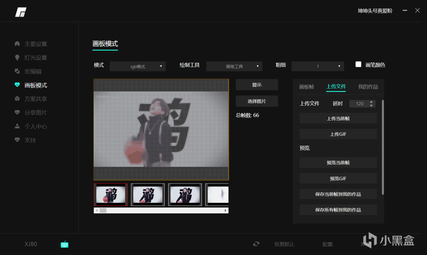 上傳圖片到小屏幕這個功能還是藏得有點隱蔽,在上傳文件-上傳文件-上傳GIF這裏,而想要只上傳當前左邊畫板中顯示的那一幀則只需要選擇上傳當前幀就行,下面預覽中的幾個選擇分別是:預覽當前幀、預覽GIF、保存當前幀、保存所有幀,這裏作用不大,所以不講了。